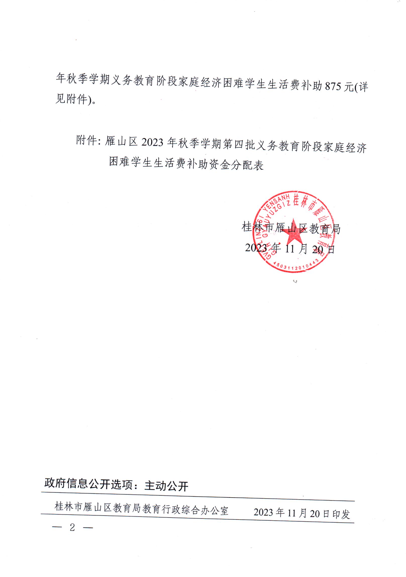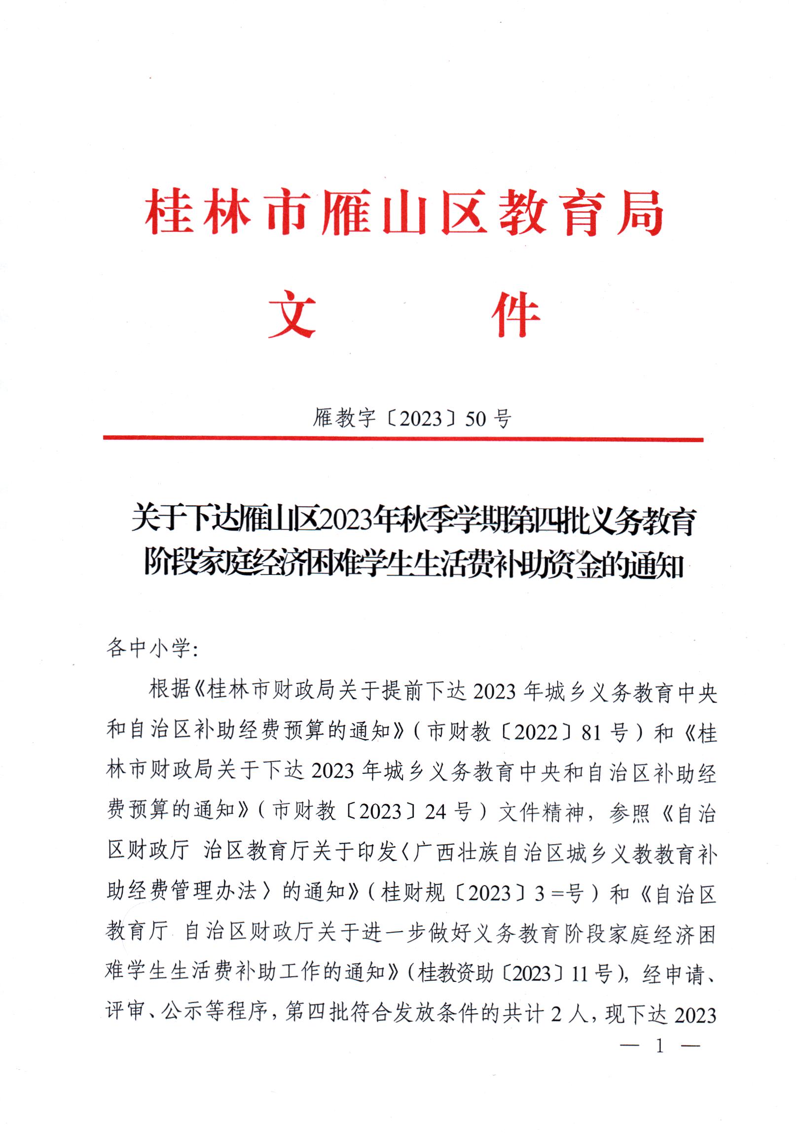 雁教字〔2023〕50号关于下达雁山区2023年秋季学期第四批义务教育阶段家庭经济困难学生生活费补助资金的通知