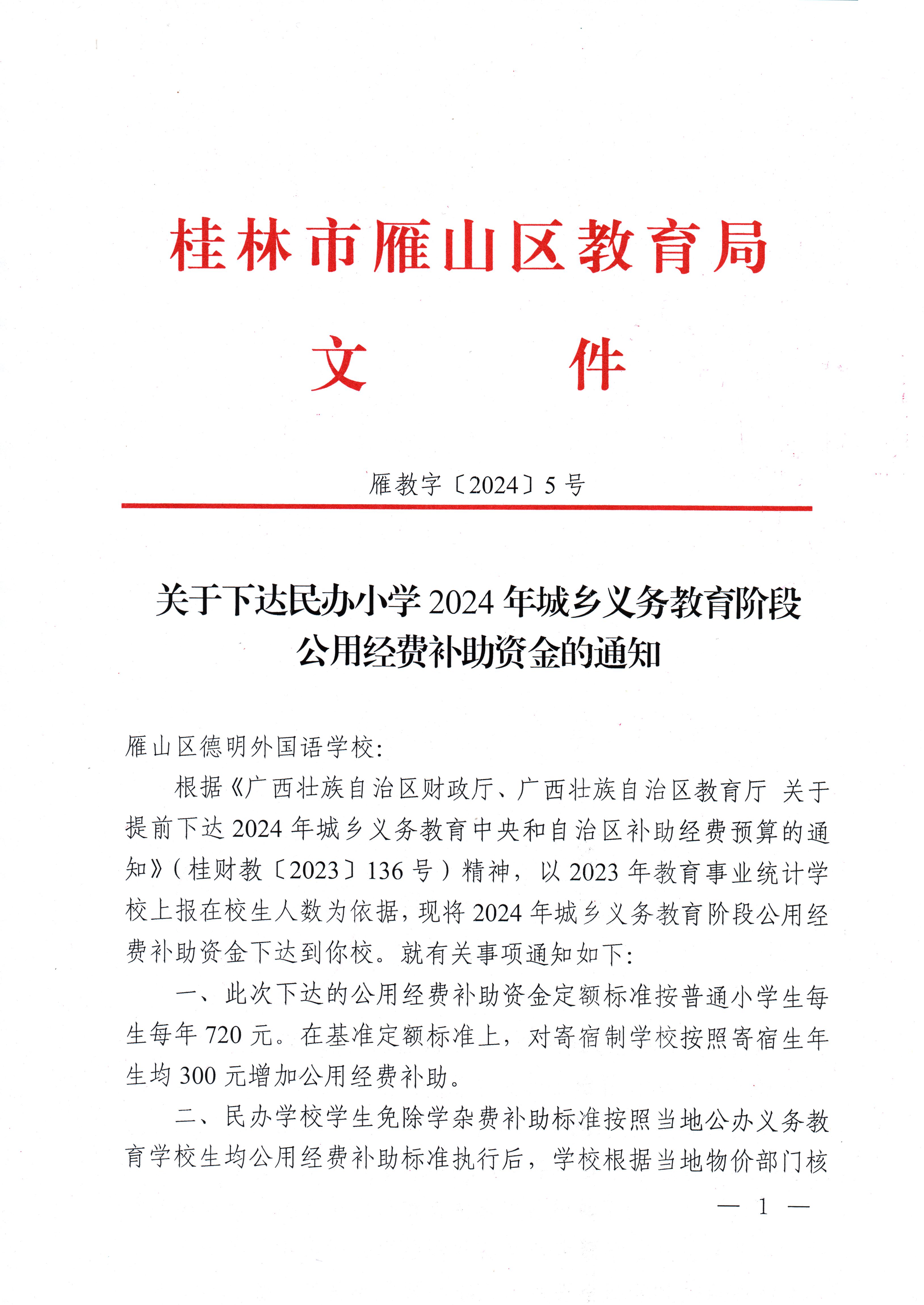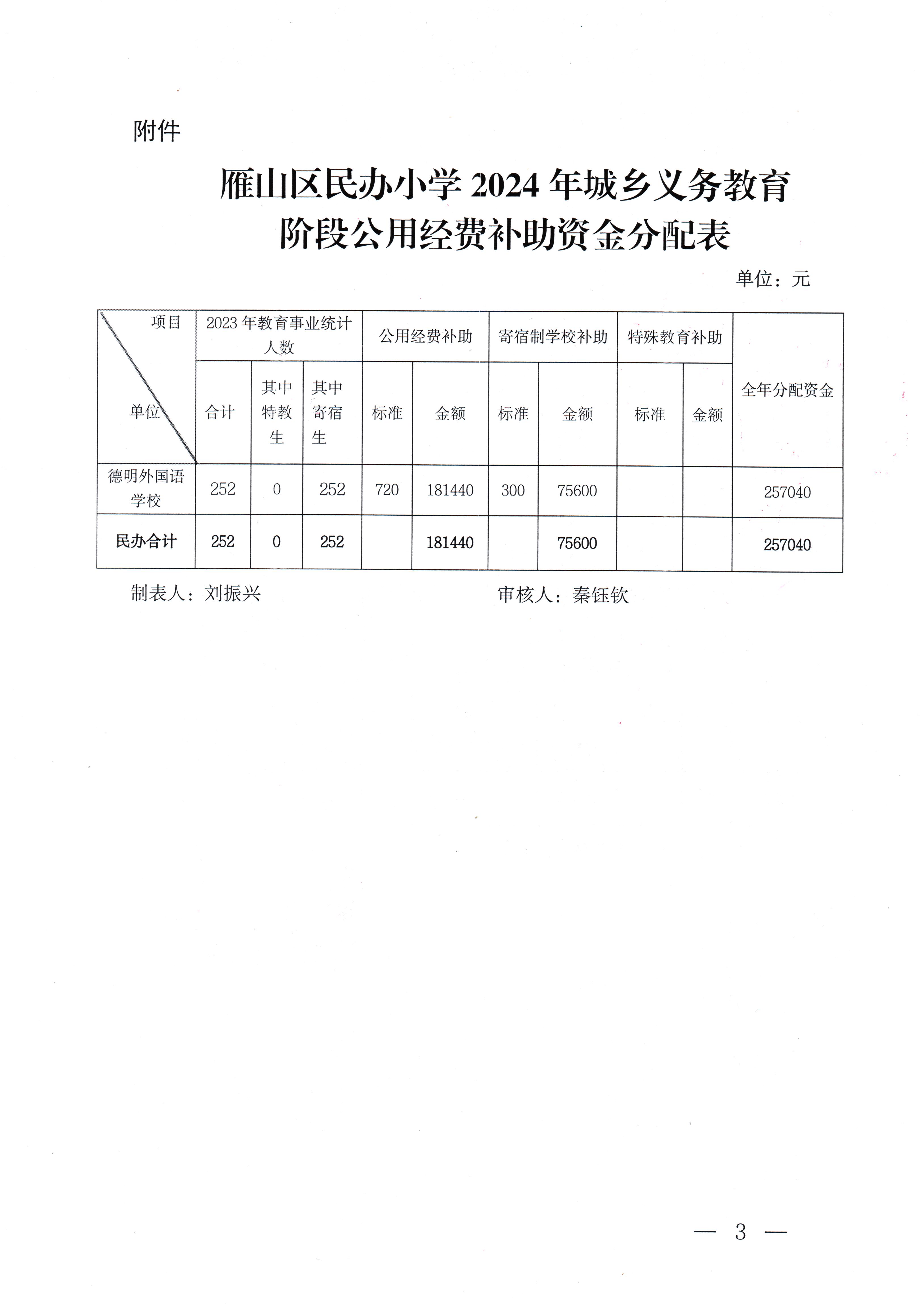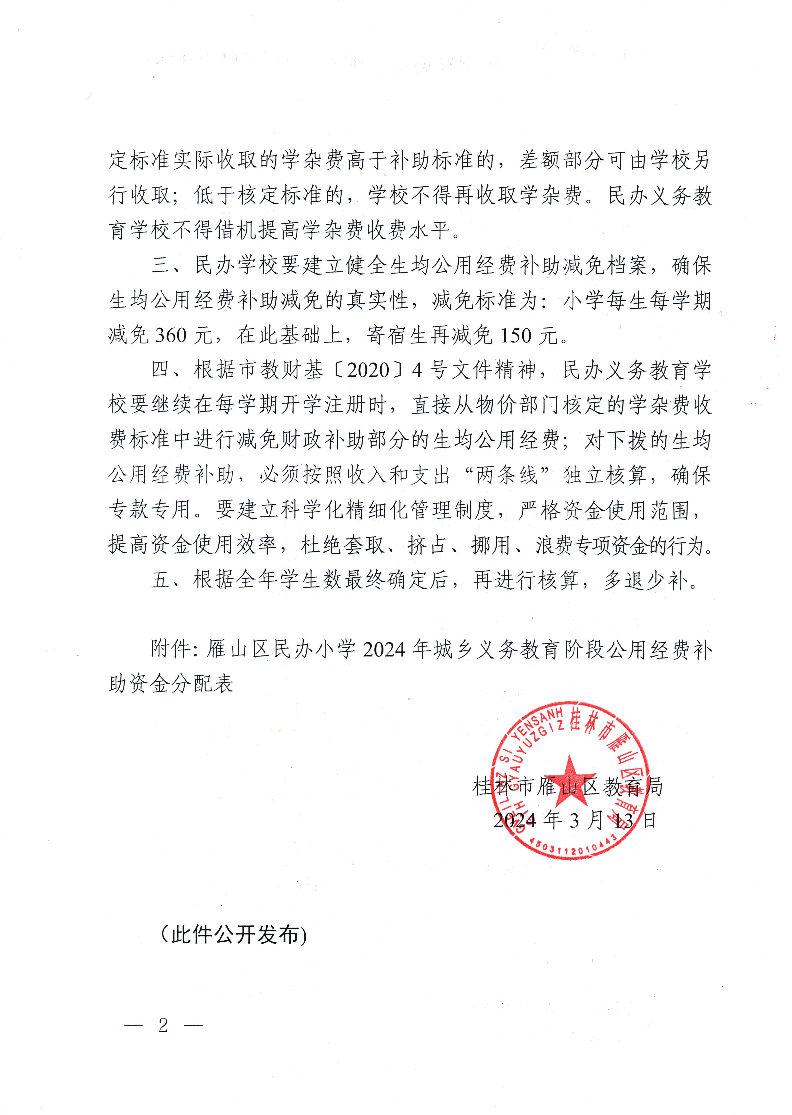 雁教字〔2024〕5号2024年民办学校义务教育经费保障机制公用经费补助资金额度的通知