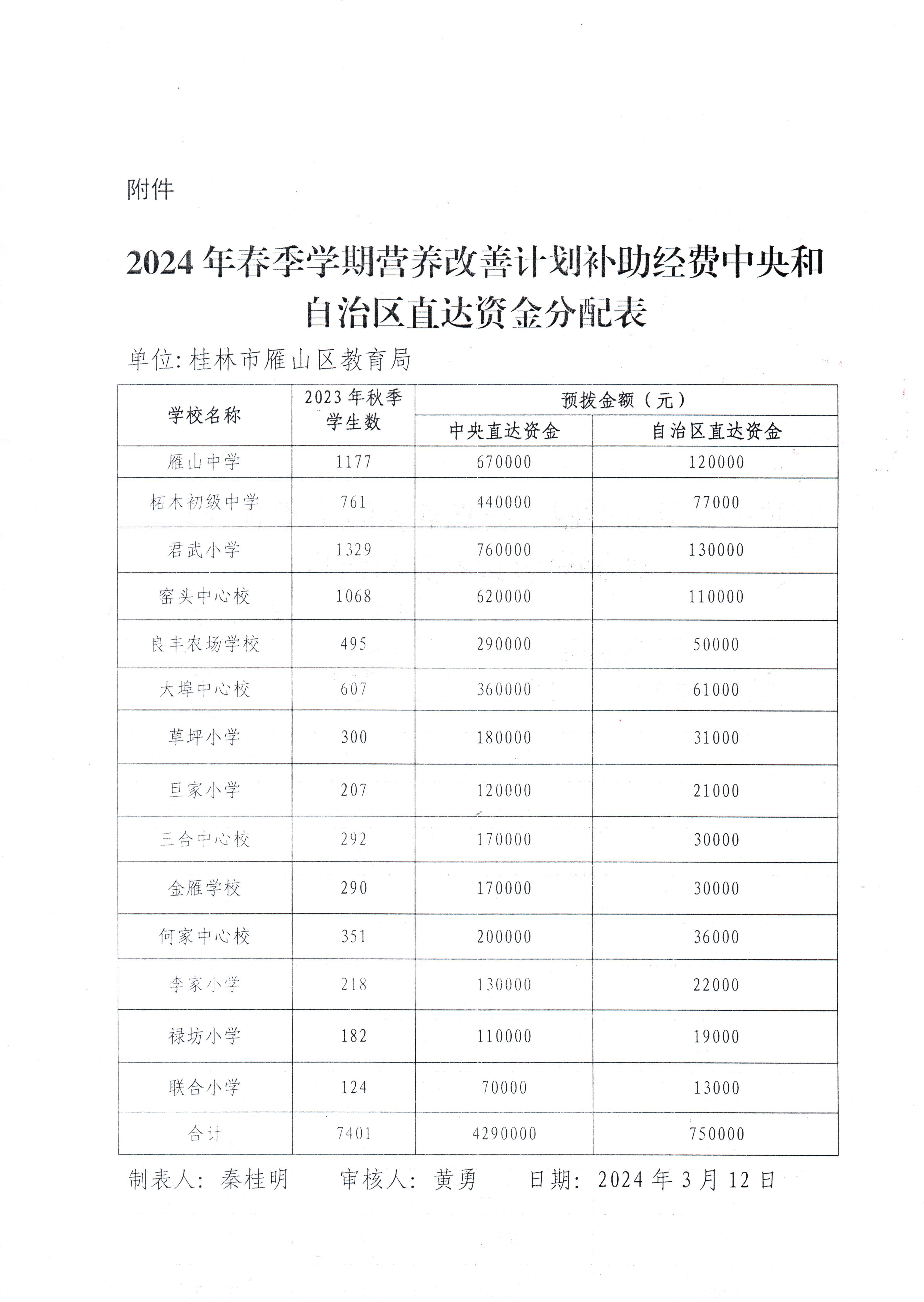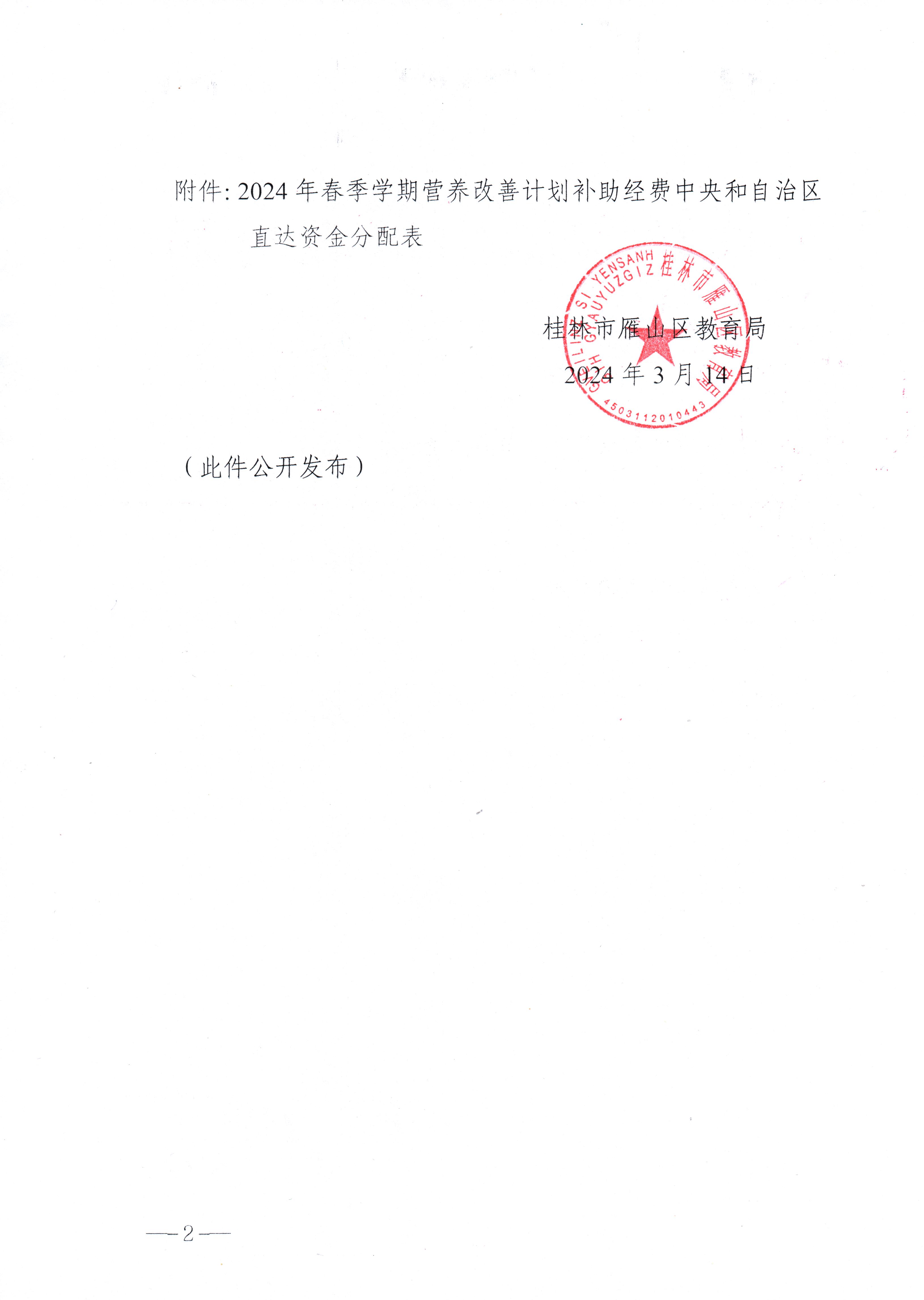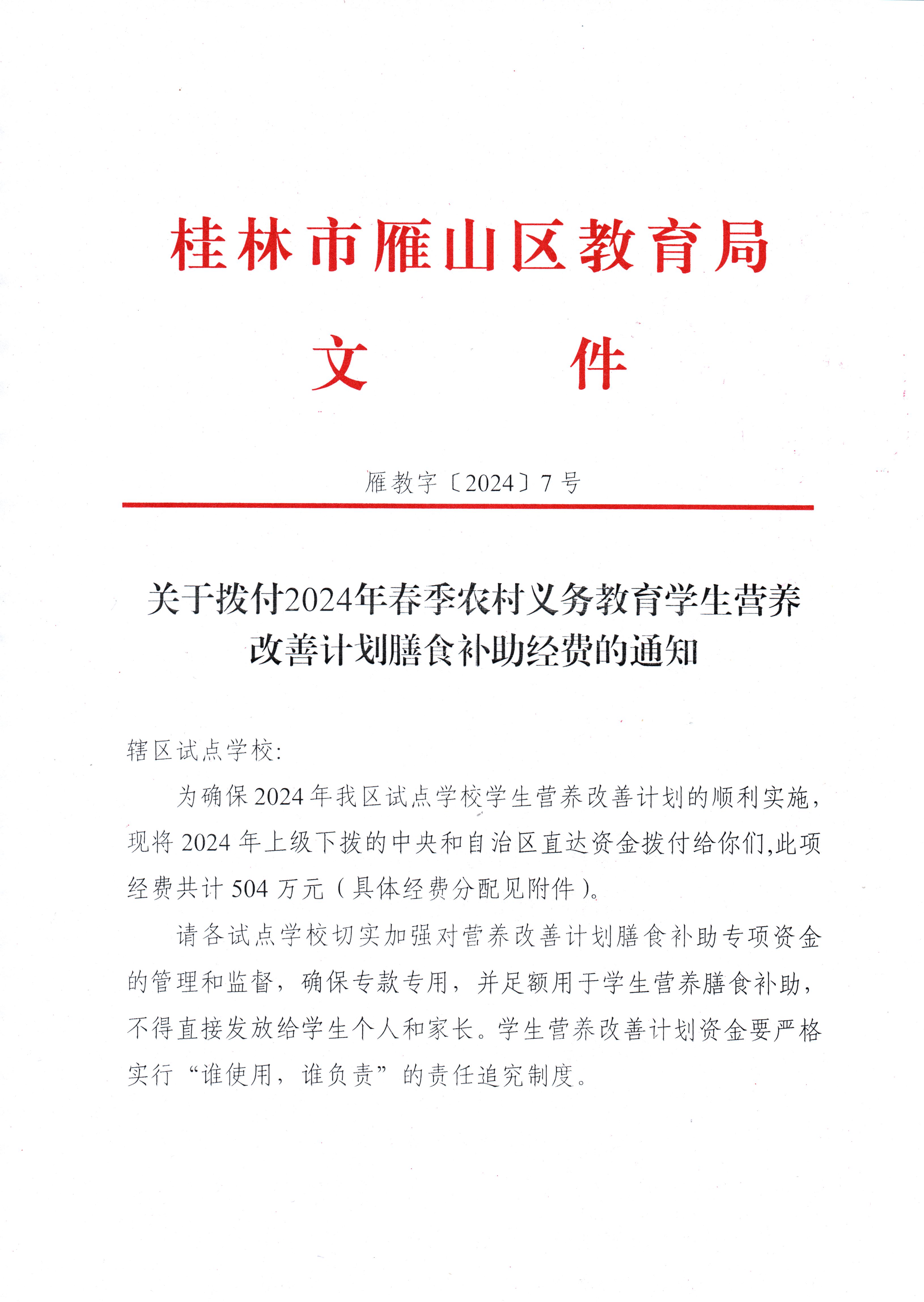 雁教字〔2024〕7号关于拨付2024年春季学期农村义务教育学生营养改善计划膳食补助经费的通知