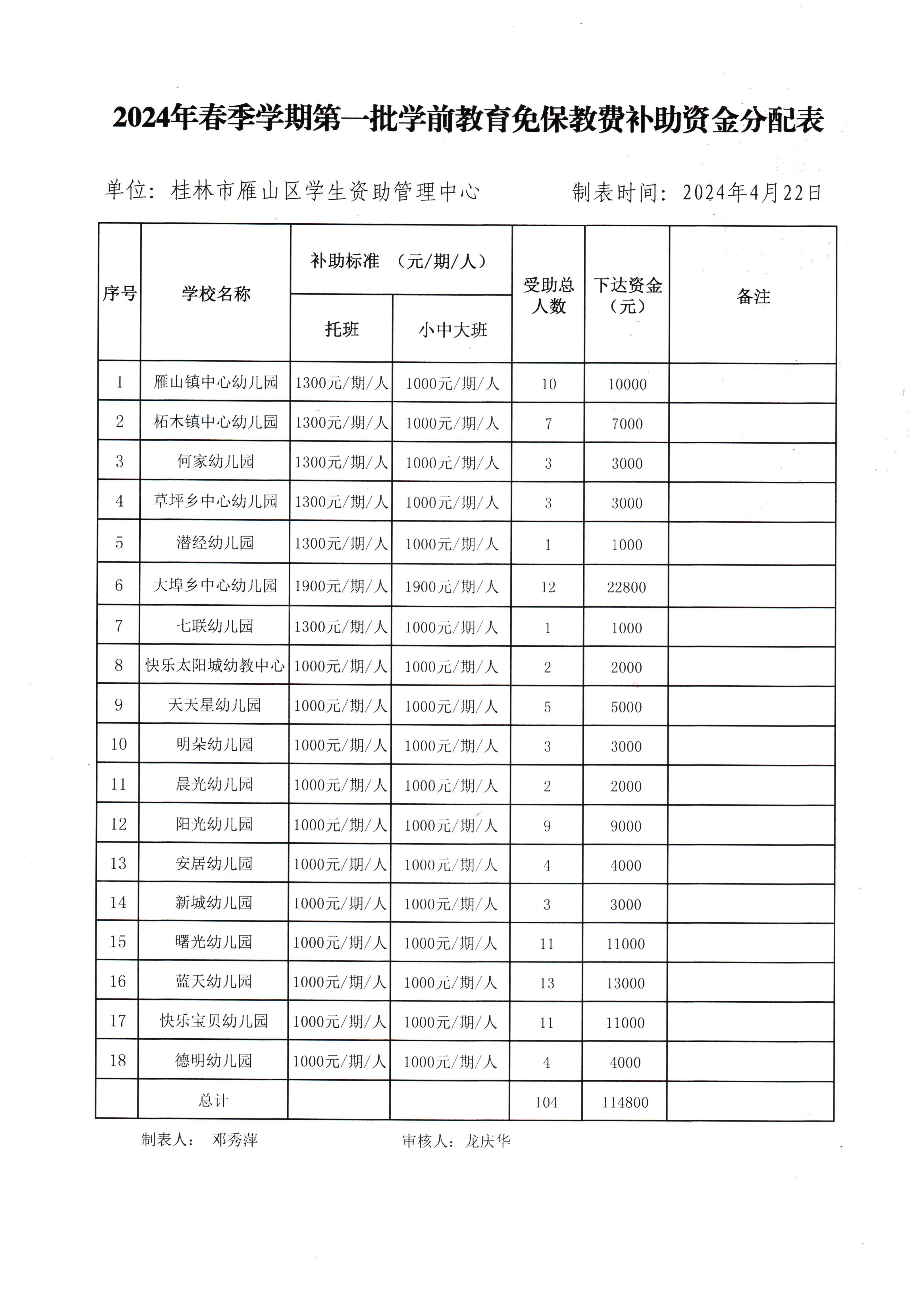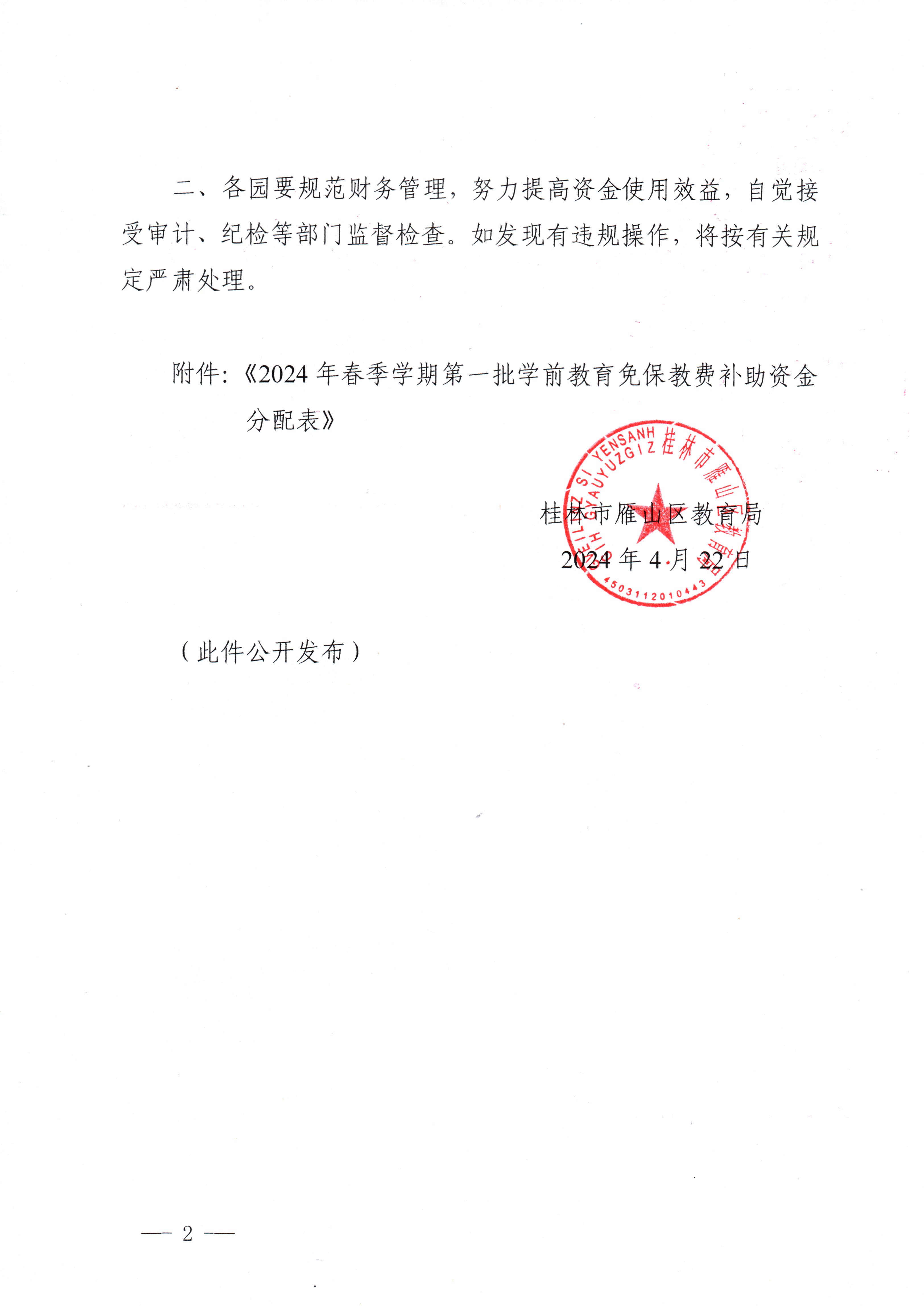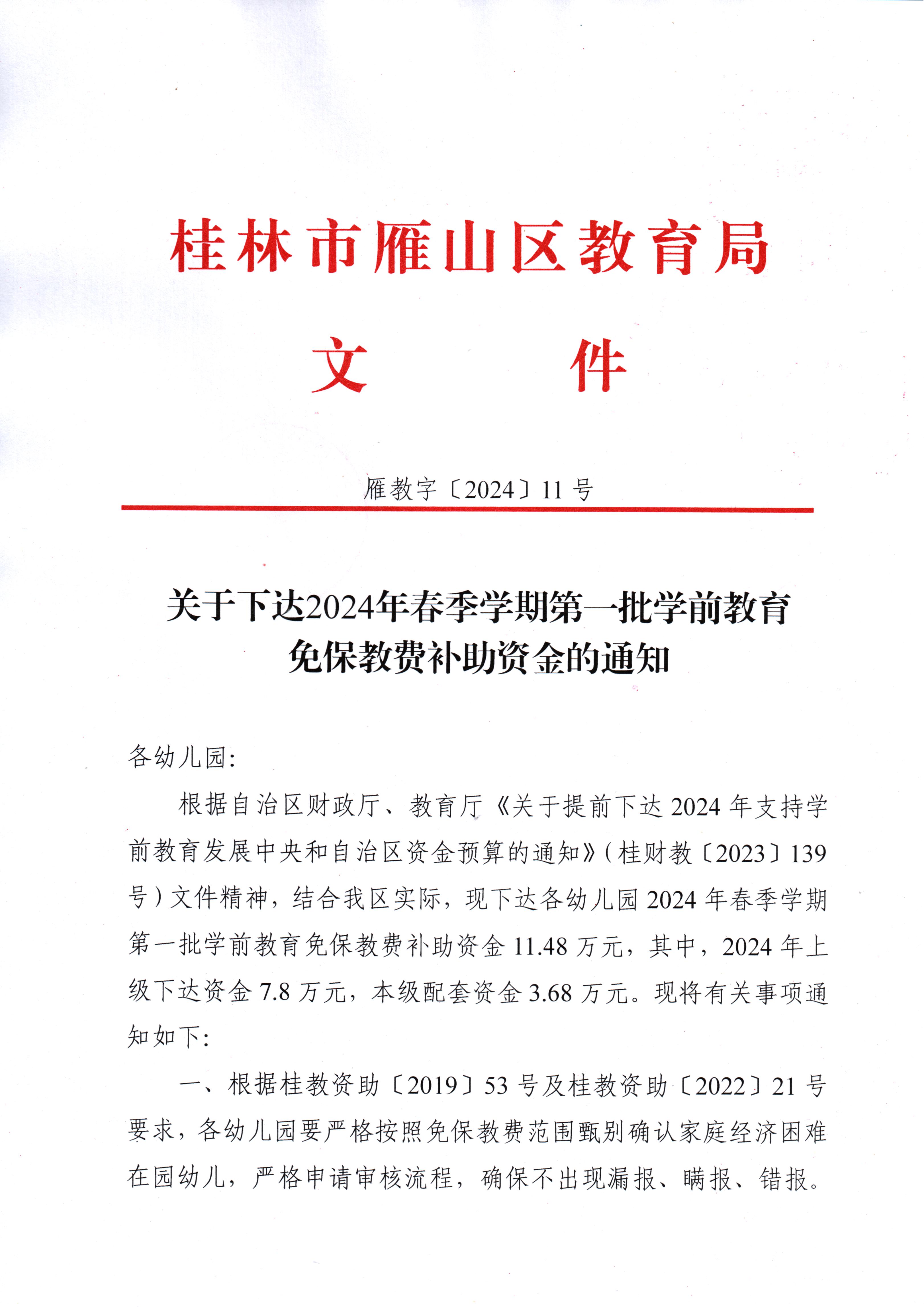 雁教字〔2024〕11号关于下达2024年春季学期第一批学前教育免保教费补助资金的通知