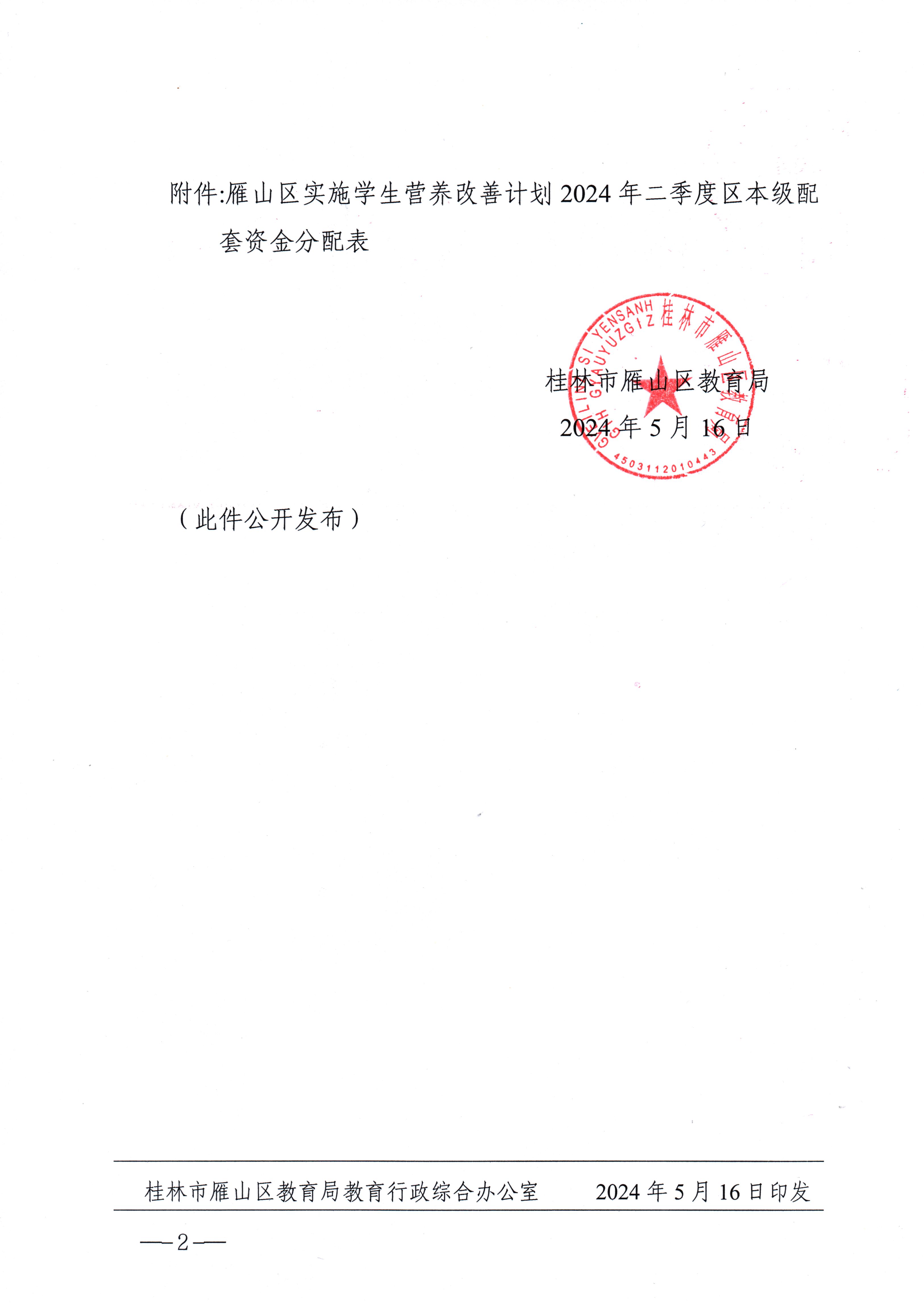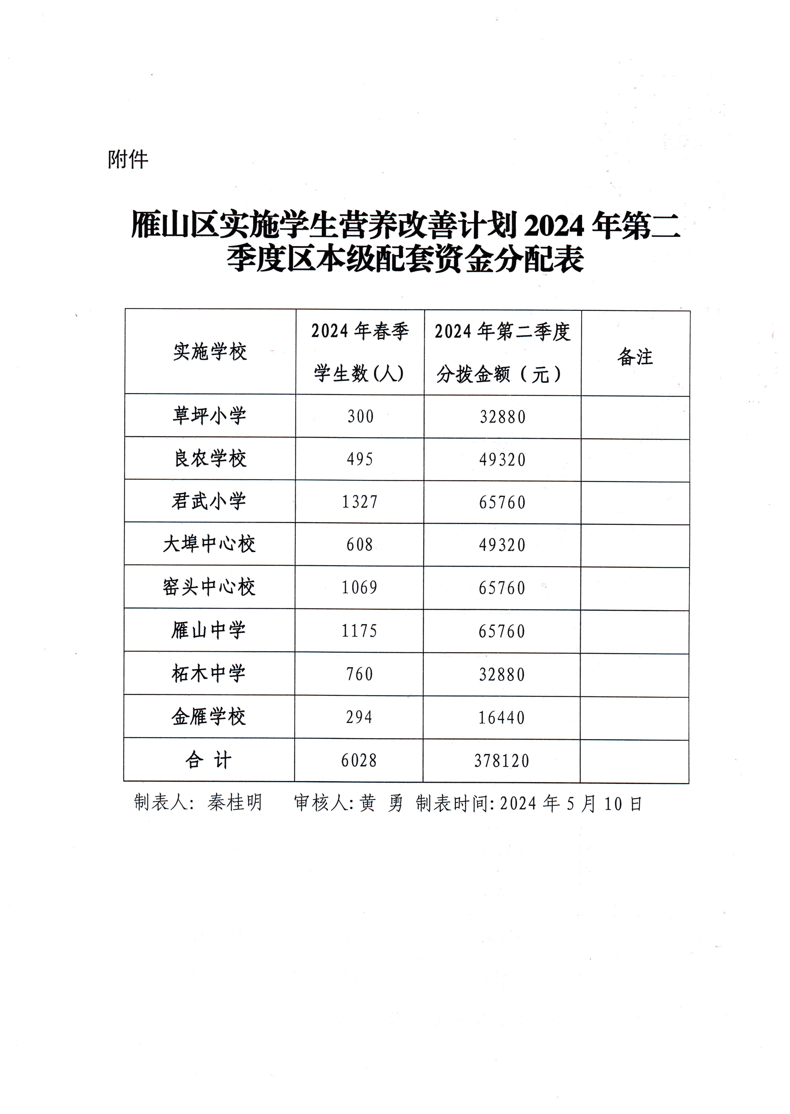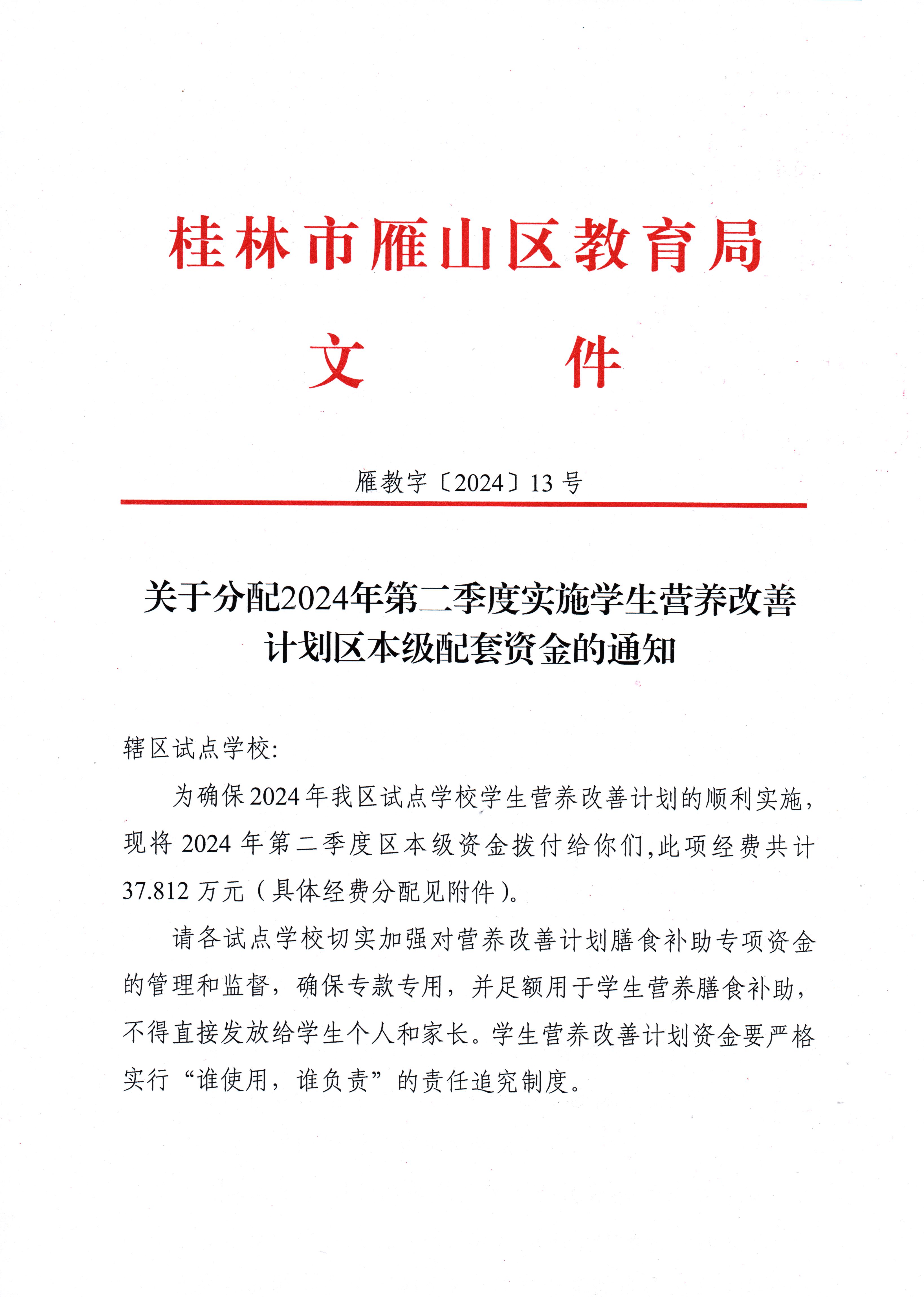 雁教字〔2024〕13号关于分配2024年第二季度实施学生营养改善计划区本级配套资金的通知