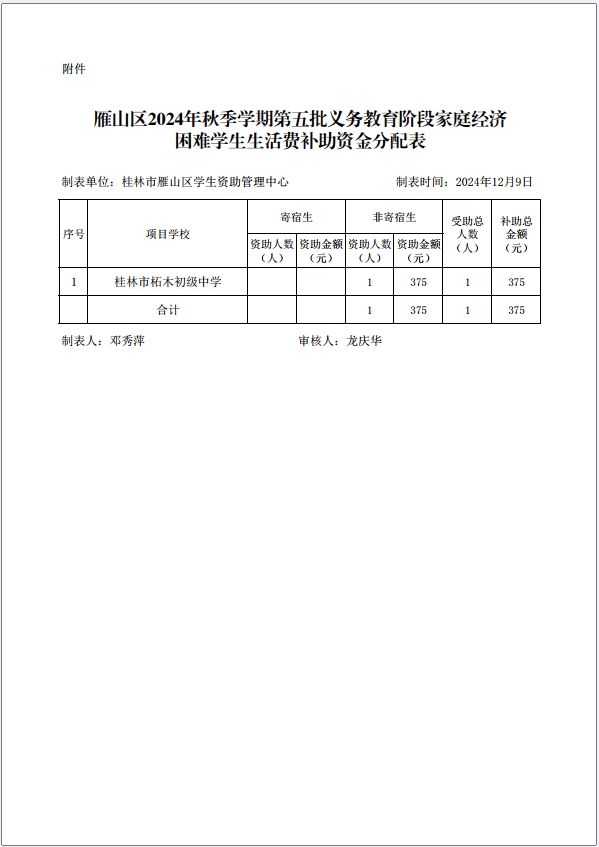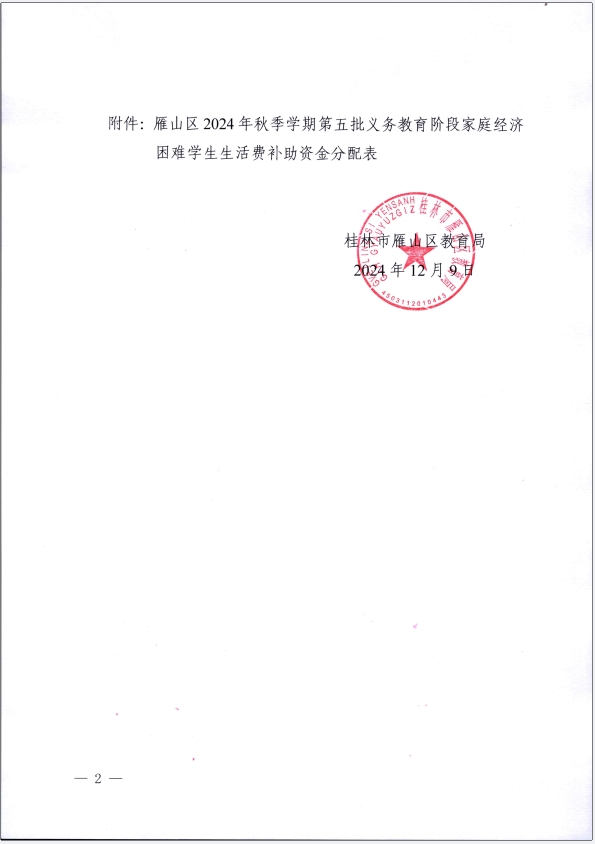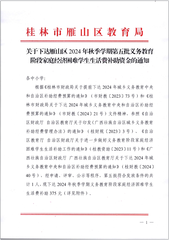 关于下达雁山区2024年秋季学期第五批义务教育阶段家庭经济困难学生生活费补助资金的通知