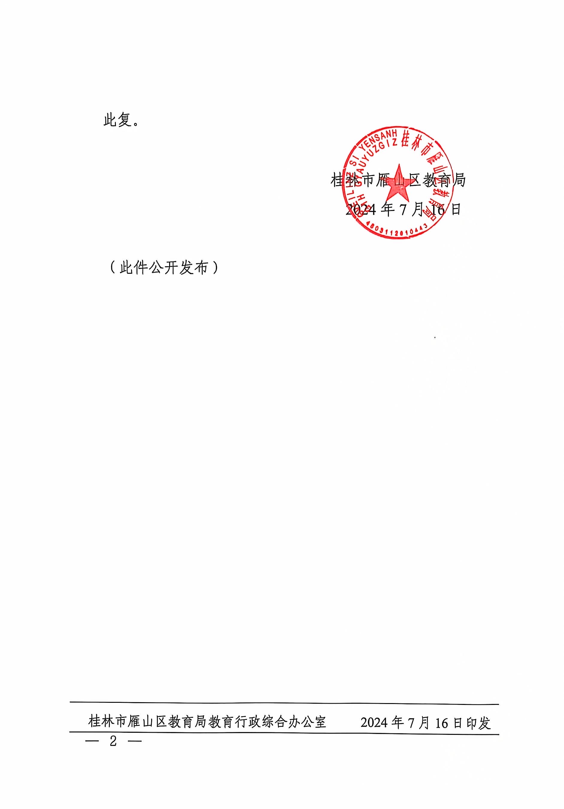 雁教字〔2024〕17号关于同意桂林市雁山区天天星幼儿园终止办学的批复
