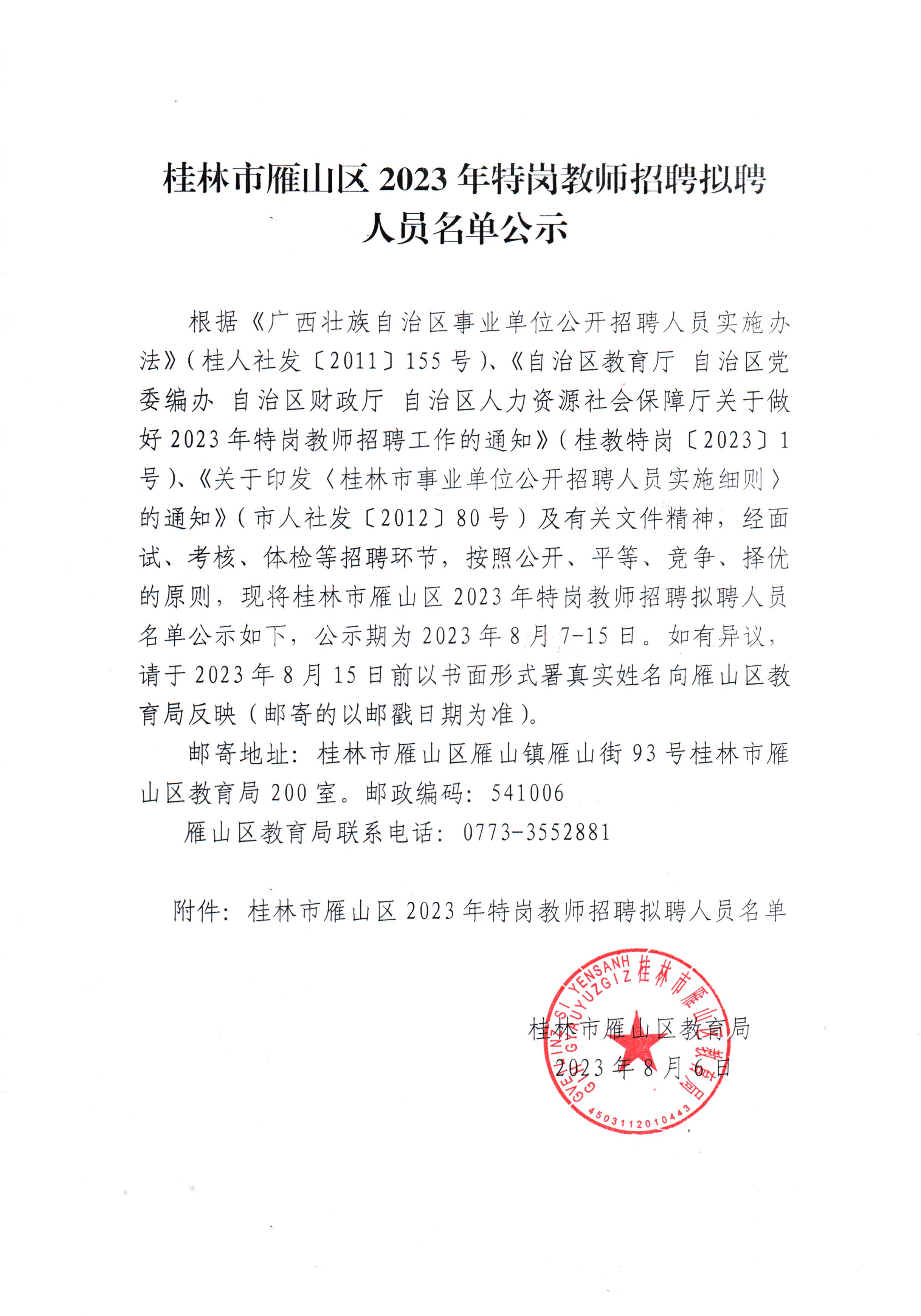 桂林市雁山区2023年特岗教师招聘拟聘人员名单公示