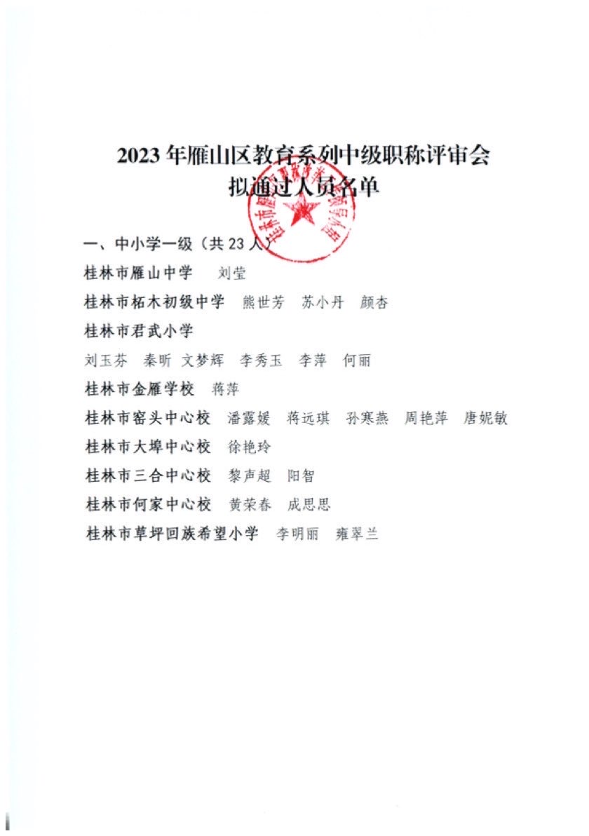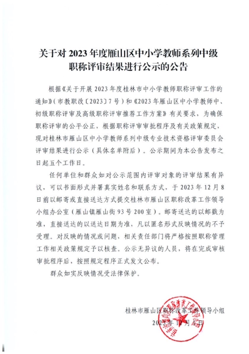 关于对2023年度雁山区中小学教师系列中级职称评审结果进行公示的公告