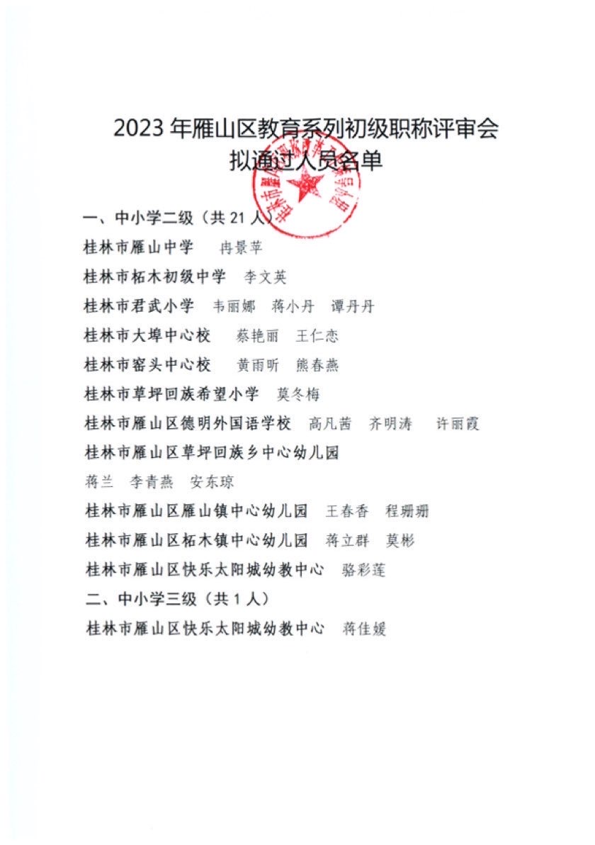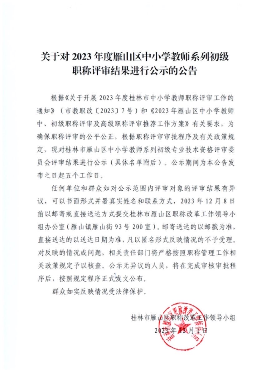 关于对2023年度雁山区中小学教师系列初级职称评审结果进行公示的公告