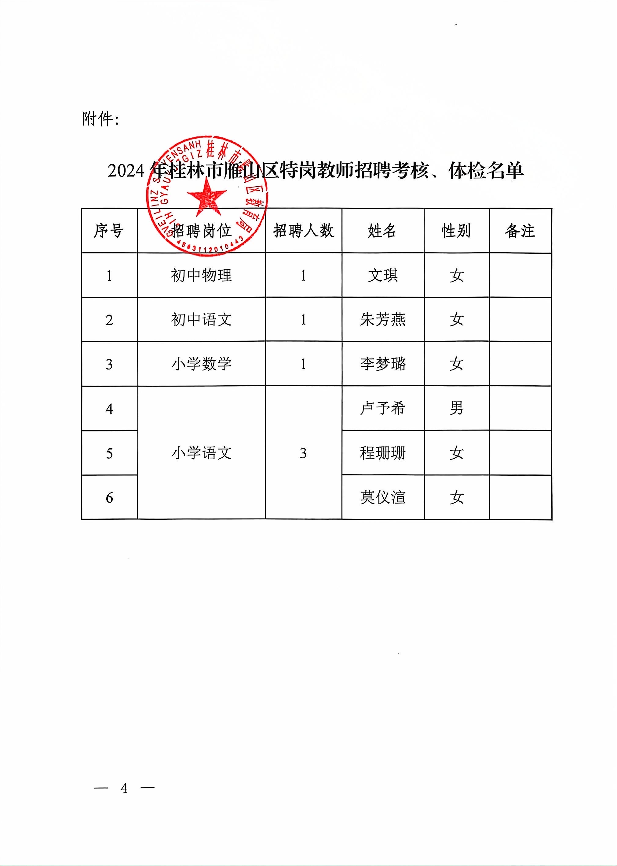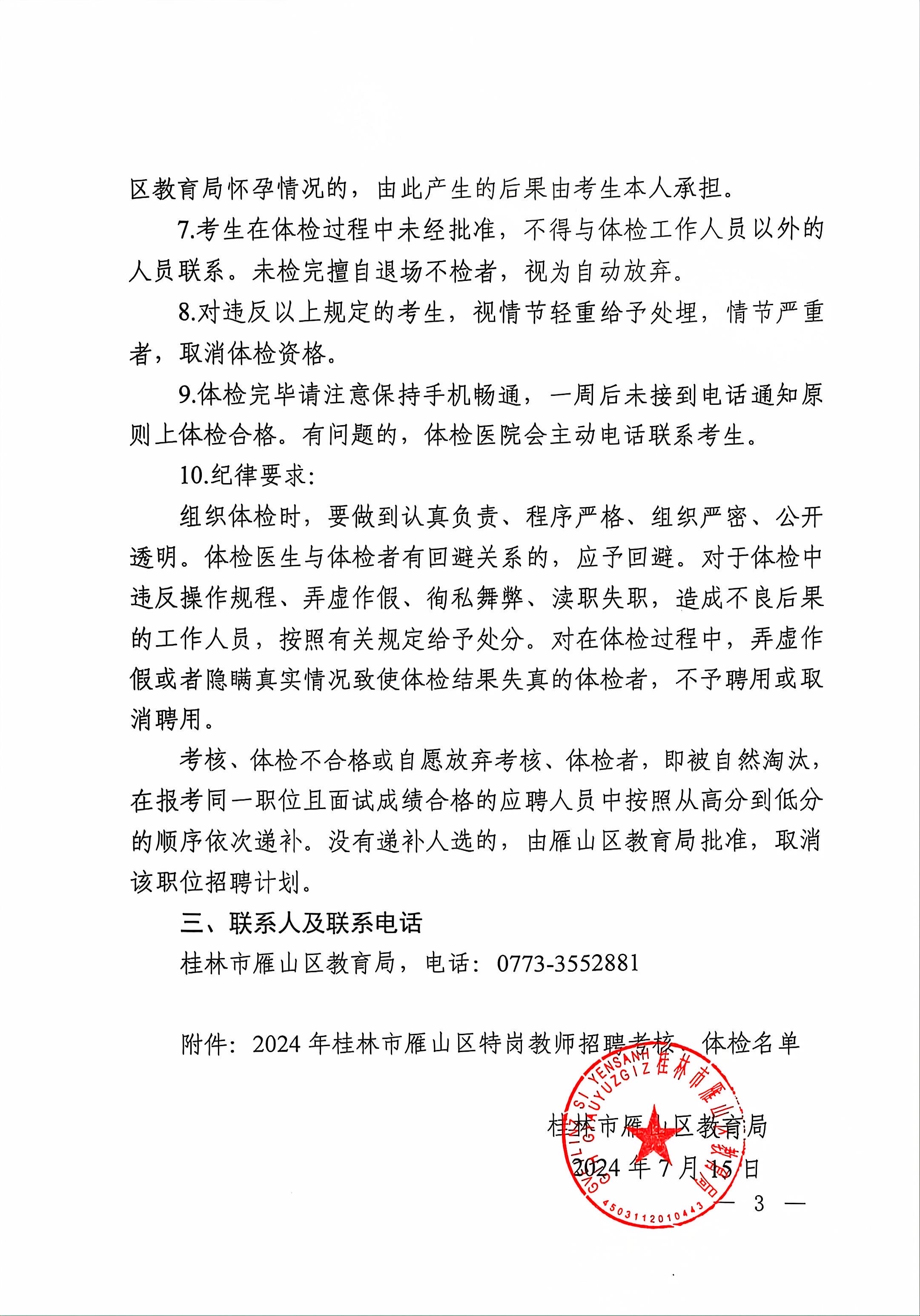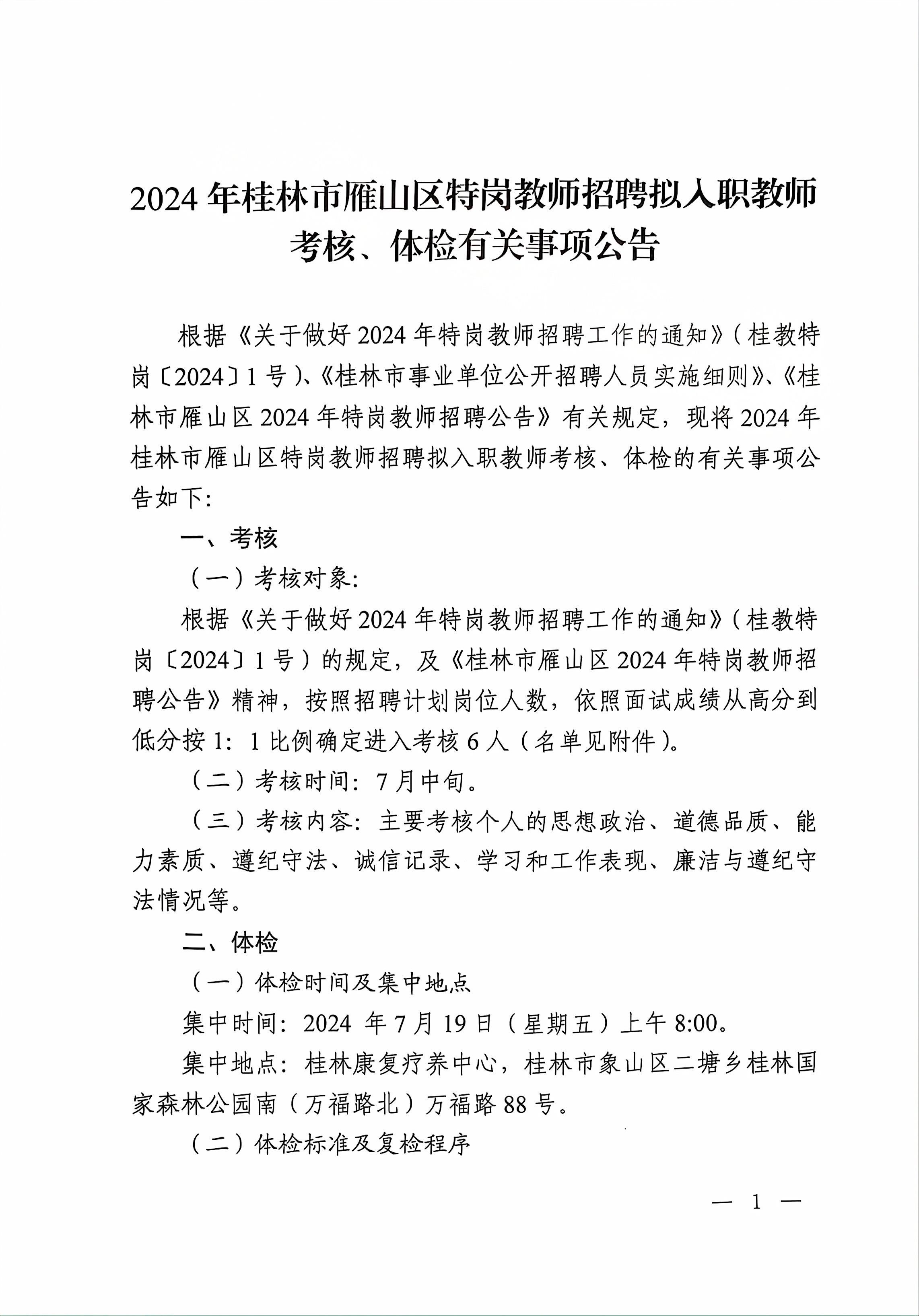 【教育局公告】2024年桂林市雁山区特岗教师招聘拟入职教师考核、体检有关事项公告
