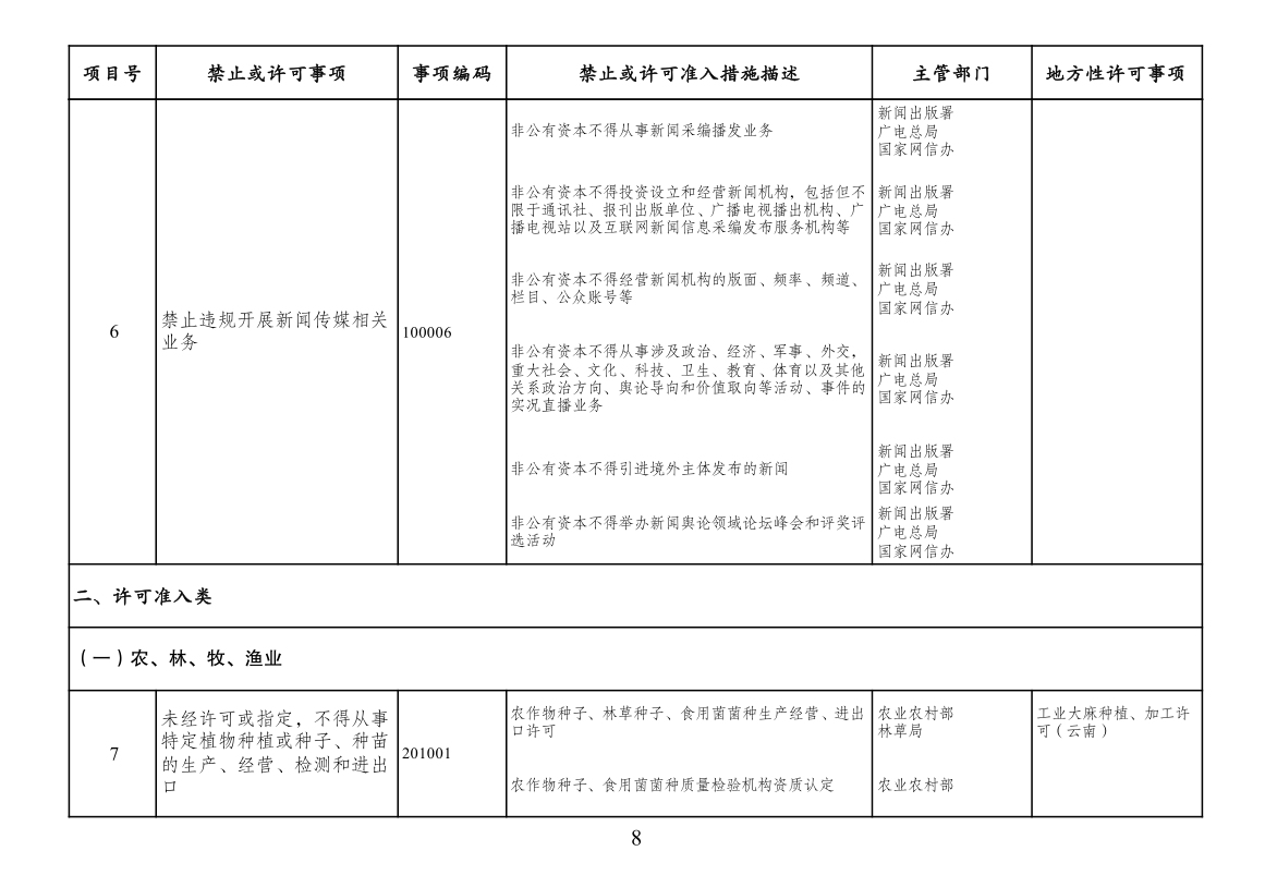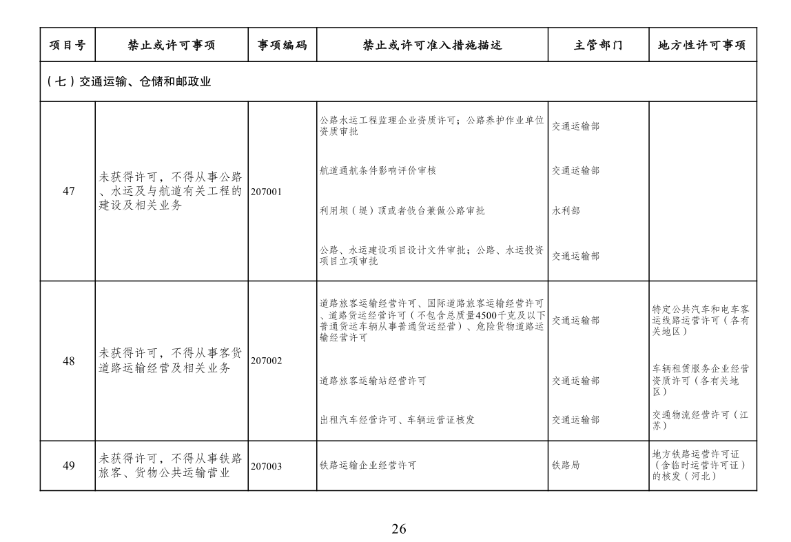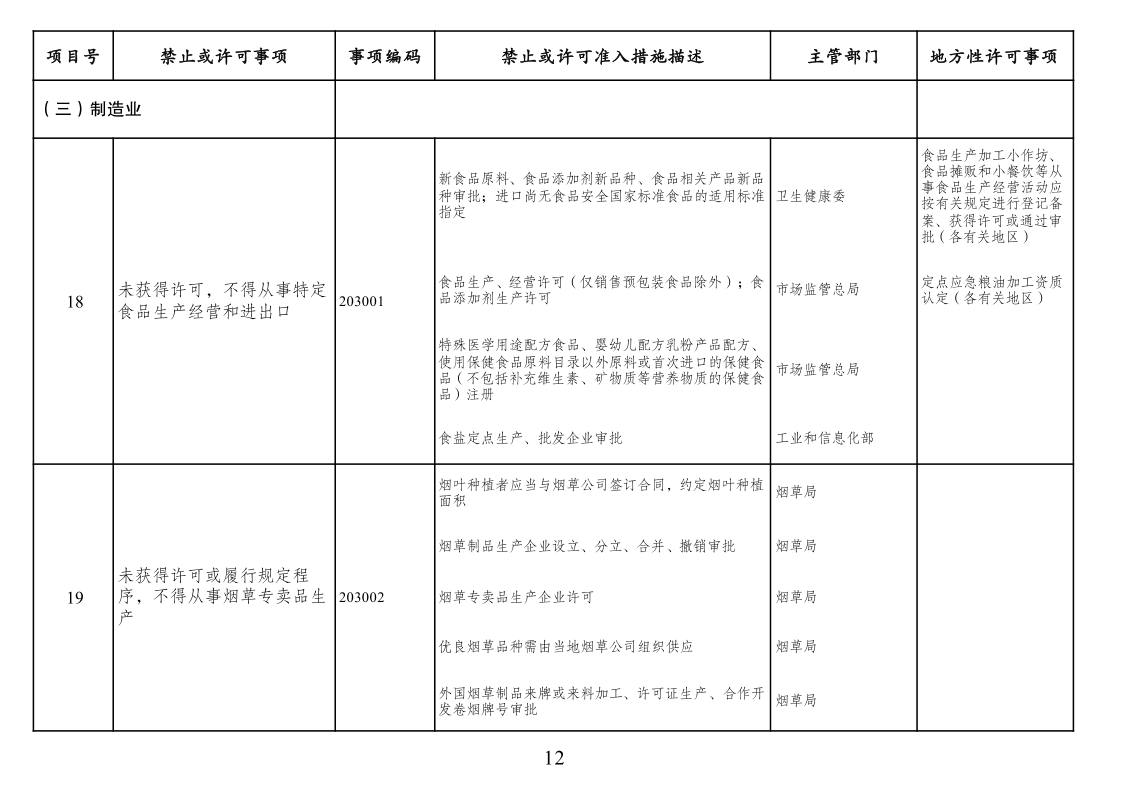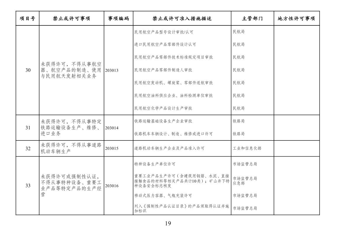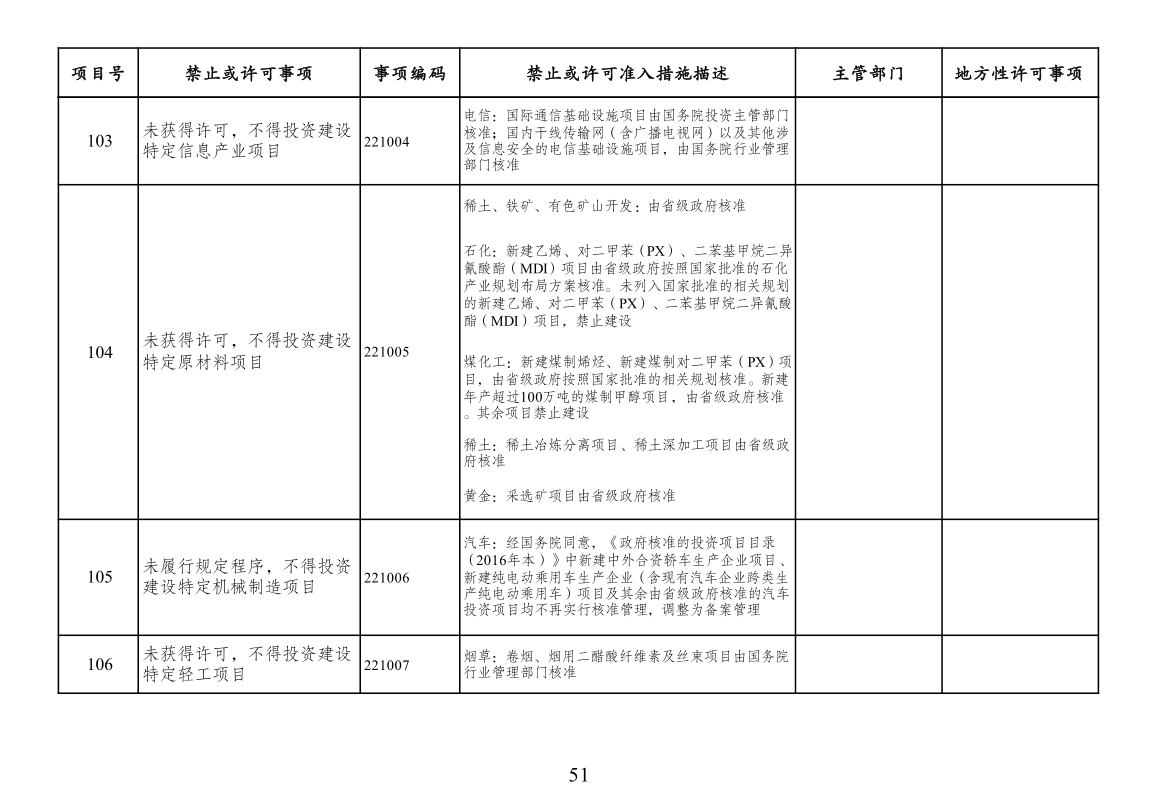 四、市场准入负面清单一致性要求。按照党中央、国务院要求编制的涉及行业性、领域性、区域性等方面,需要用负面清单管理方式出台相关措施的,应纳入全国统一的市场准入负面清单。产业结构调整指导目录、政府核准的投资项目目录纳入市场准入负面清单,地方对两个目录有细化规定的,从其规定。地方国家重点生态功能区和农产品主产区产业准入负面清单(或禁止限制目录)及地方按照党中央、国务院要求制定的地方性产业结构禁止准入目录,统一纳入市场准入负面清单。各地区、各部门不得另行制定市场准入性质的负面清单。
