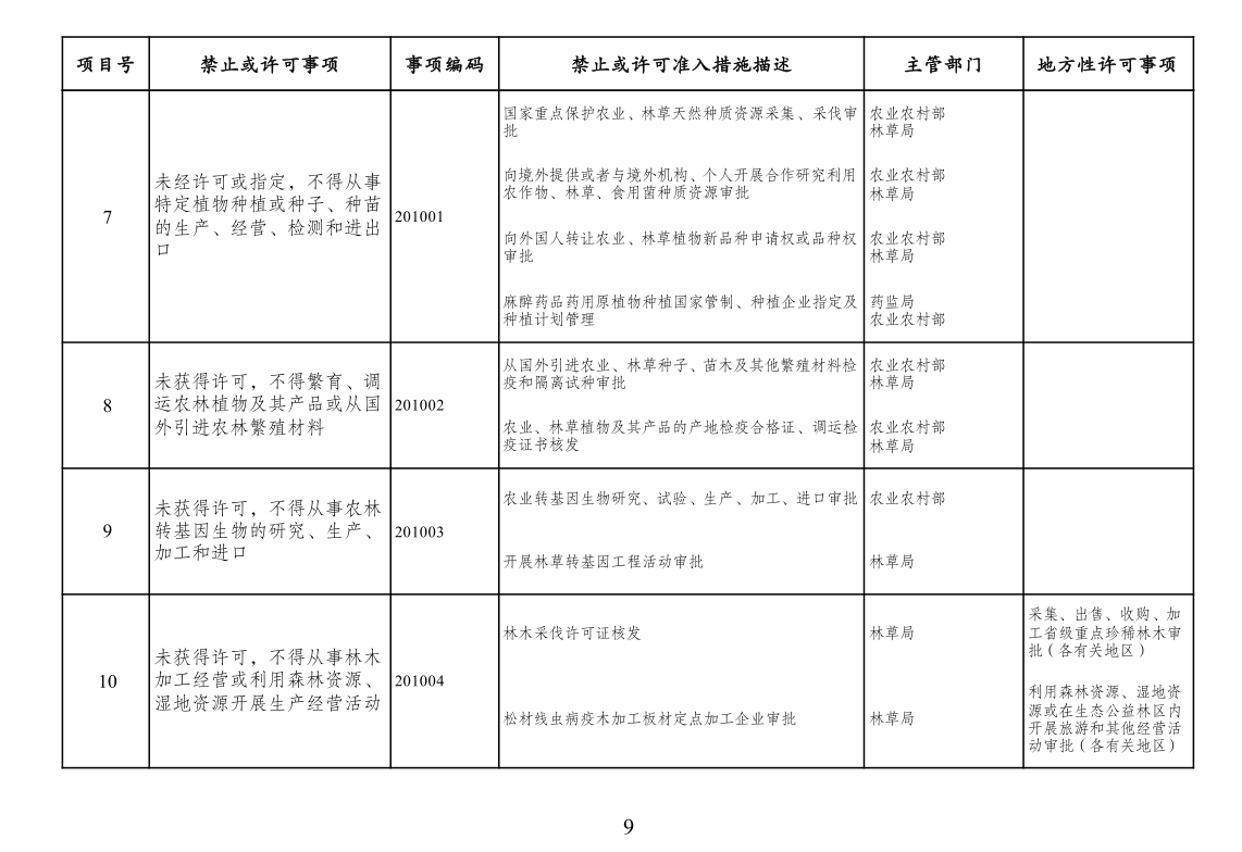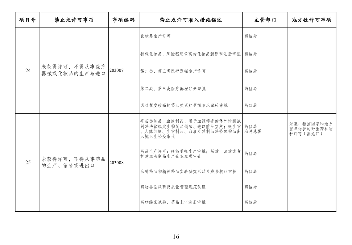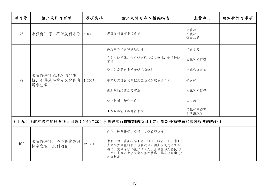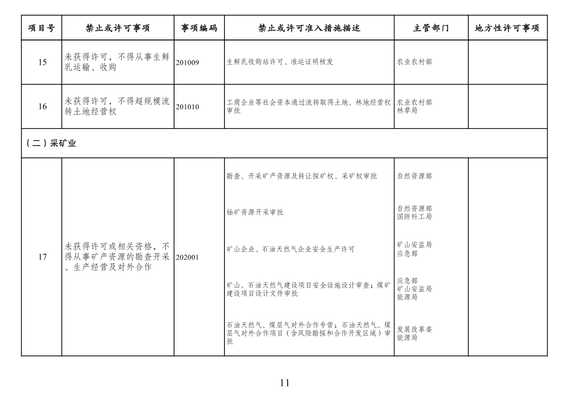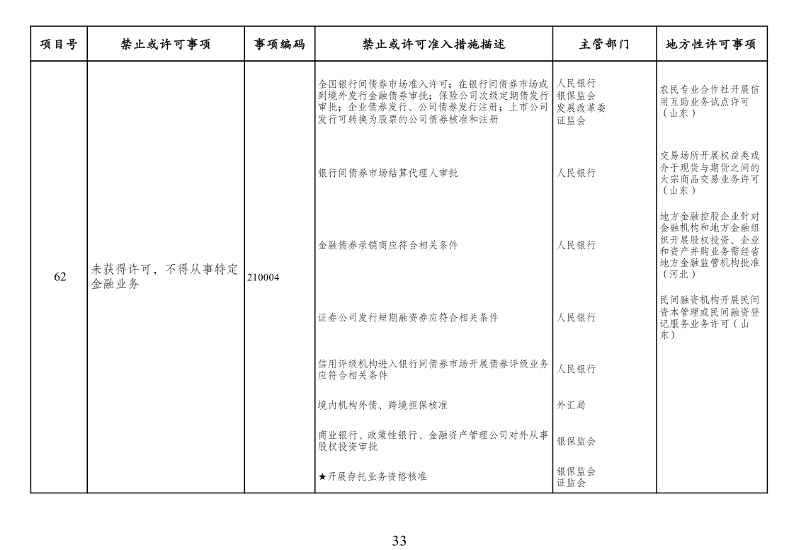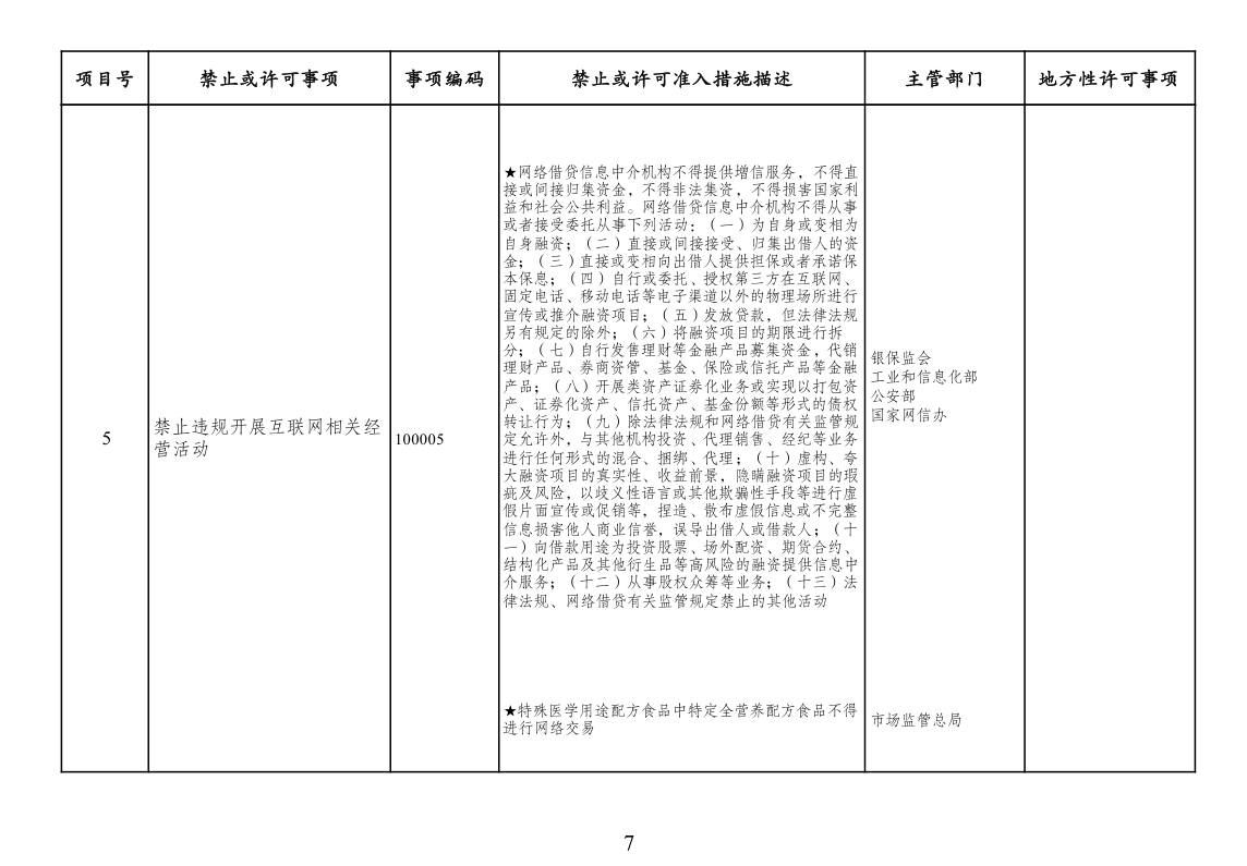 四、市场准入负面清单一致性要求。按照党中央、国务院要求编制的涉及行业性、领域性、区域性等方面,需要用负面清单管理方式出台相关措施的,应纳入全国统一的市场准入负面清单。产业结构调整指导目录、政府核准的投资项目目录纳入市场准入负面清单,地方对两个目录有细化规定的,从其规定。地方国家重点生态功能区和农产品主产区产业准入负面清单(或禁止限制目录)及地方按照党中央、国务院要求制定的地方性产业结构禁止准入目录,统一纳入市场准入负面清单。各地区、各部门不得另行制定市场准入性质的负面清单。