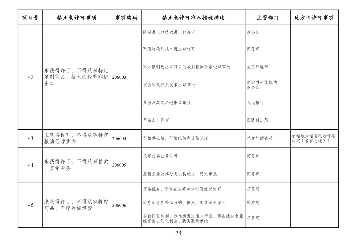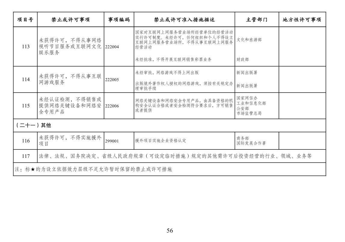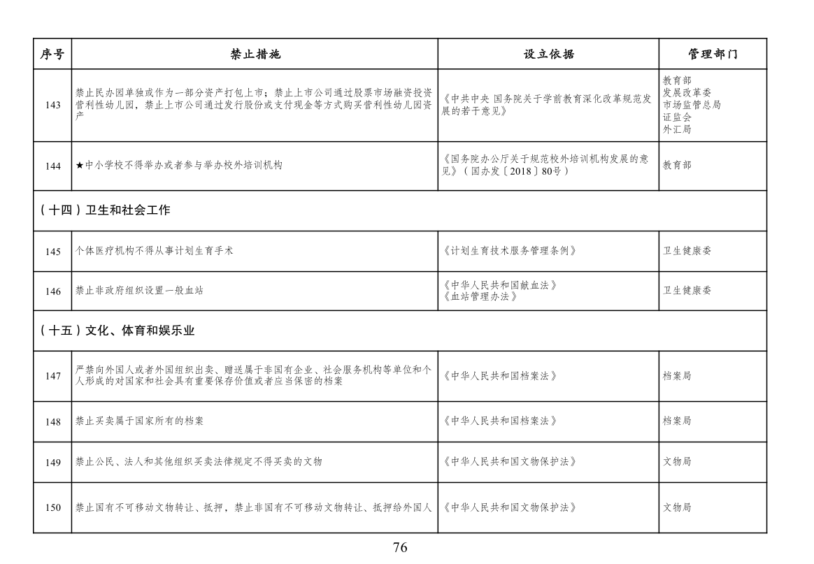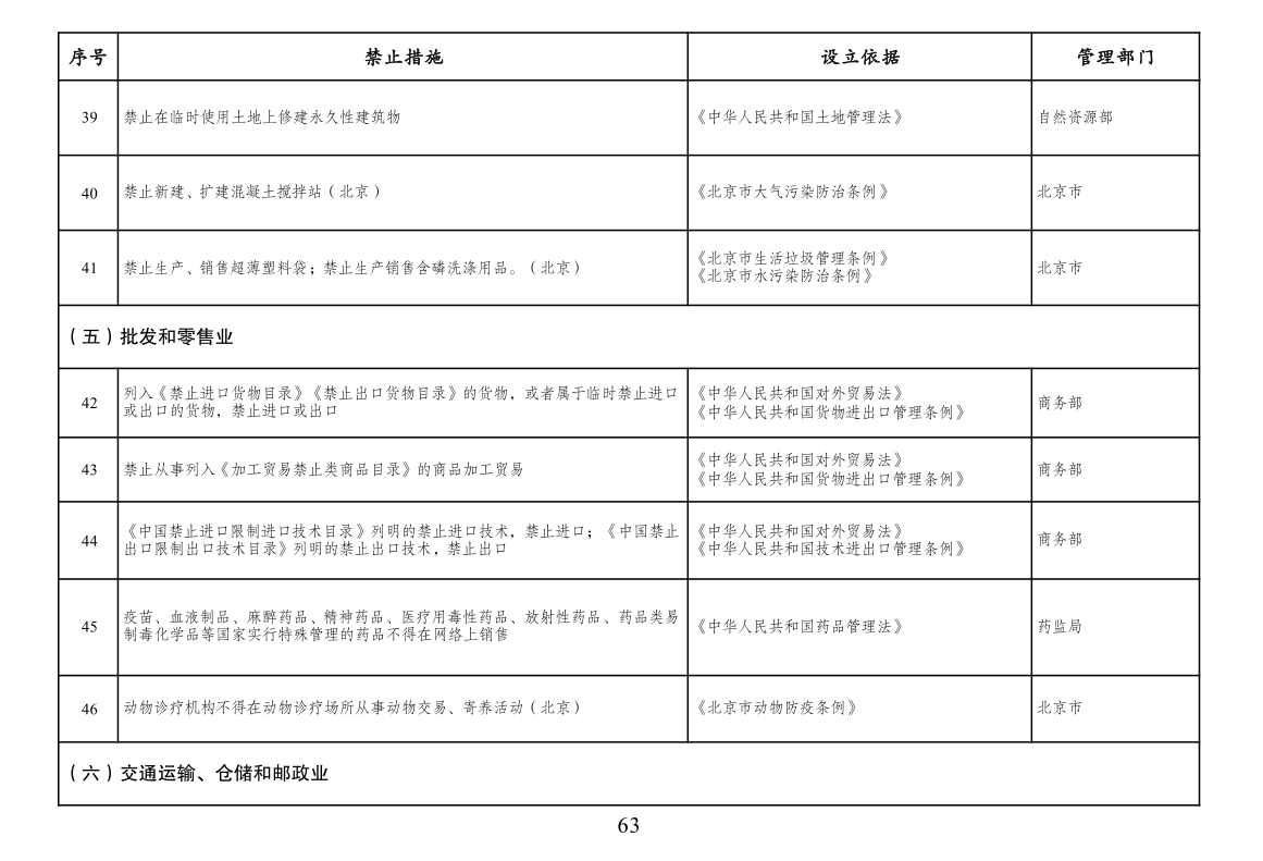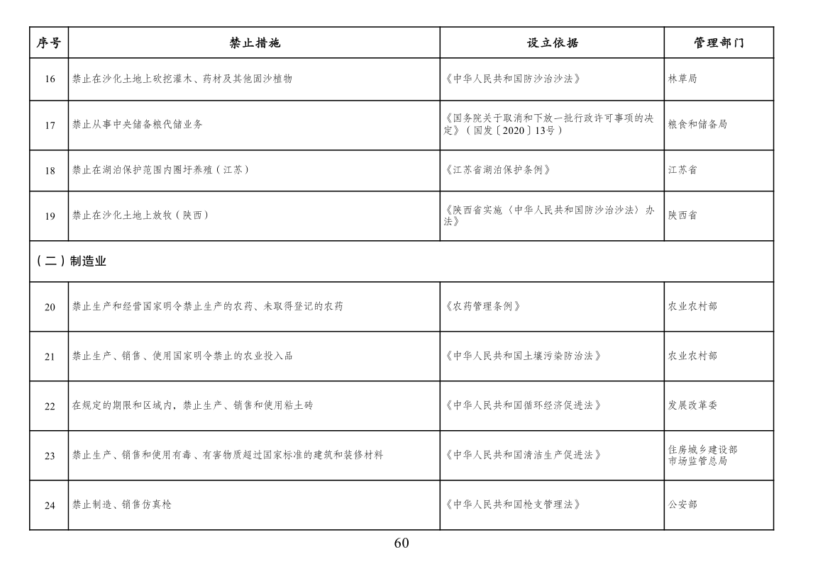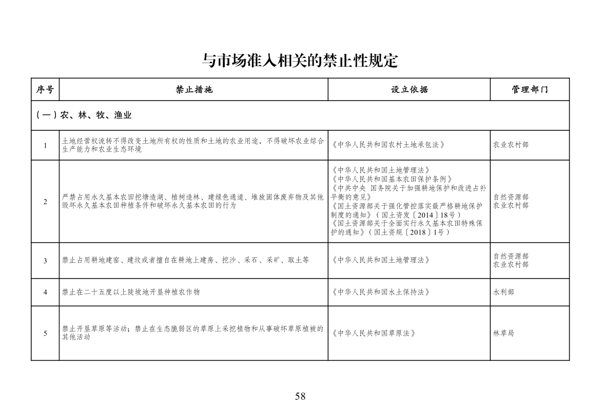 本附件所列禁止措施是现有法律、法规、国务院决定等明确设立、且与市场主体投资经营活动密切相关的禁止性规定,在此汇总列出,以便市场主体参考。法律、法规、国务院决定设立的其他禁止性措施,从其规定。