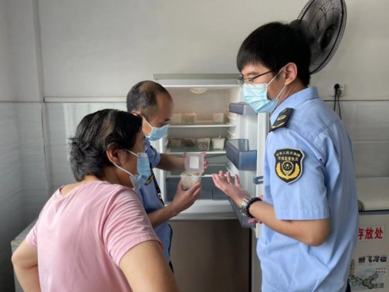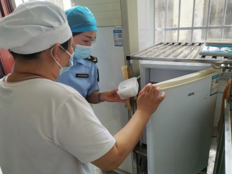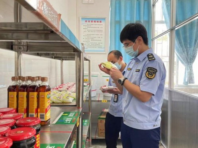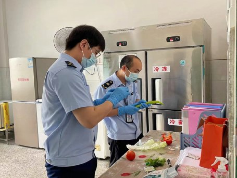 由于夏季高温多雨潮湿,食物相对容易腐败变质,因此执法人员就考点食堂的加工场所环境卫生、从业人员健康管理、餐食加工制作过程、进货查验及库存仓储等方面进行全面严密检查,同时针对审定的中考菜单,督促从业人员遵循相应操作注意事项,避免食品安全事故发生,确保食堂在中考期间顺利供餐。