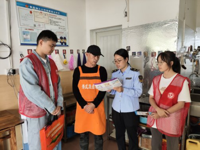 执法人员与“八桂食安”志愿者向食品生产者普及相关法律法规知识