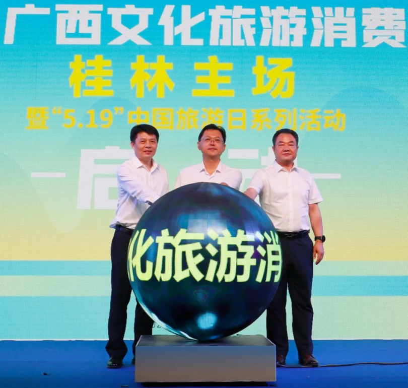 自治区文化和旅游厅二级巡视员吴玉国(中)、桂林市二级巡视员刘祖军(右)、雁山区委书记李强(左)一同触摸活动启动球,标志活动正式启动。