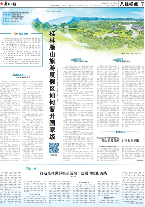 6月19日,《广西日报》以要闻消息+专版文章的大篇幅形式,对桂林雁山国家级旅游度假区进行了深度报道。详情如下: