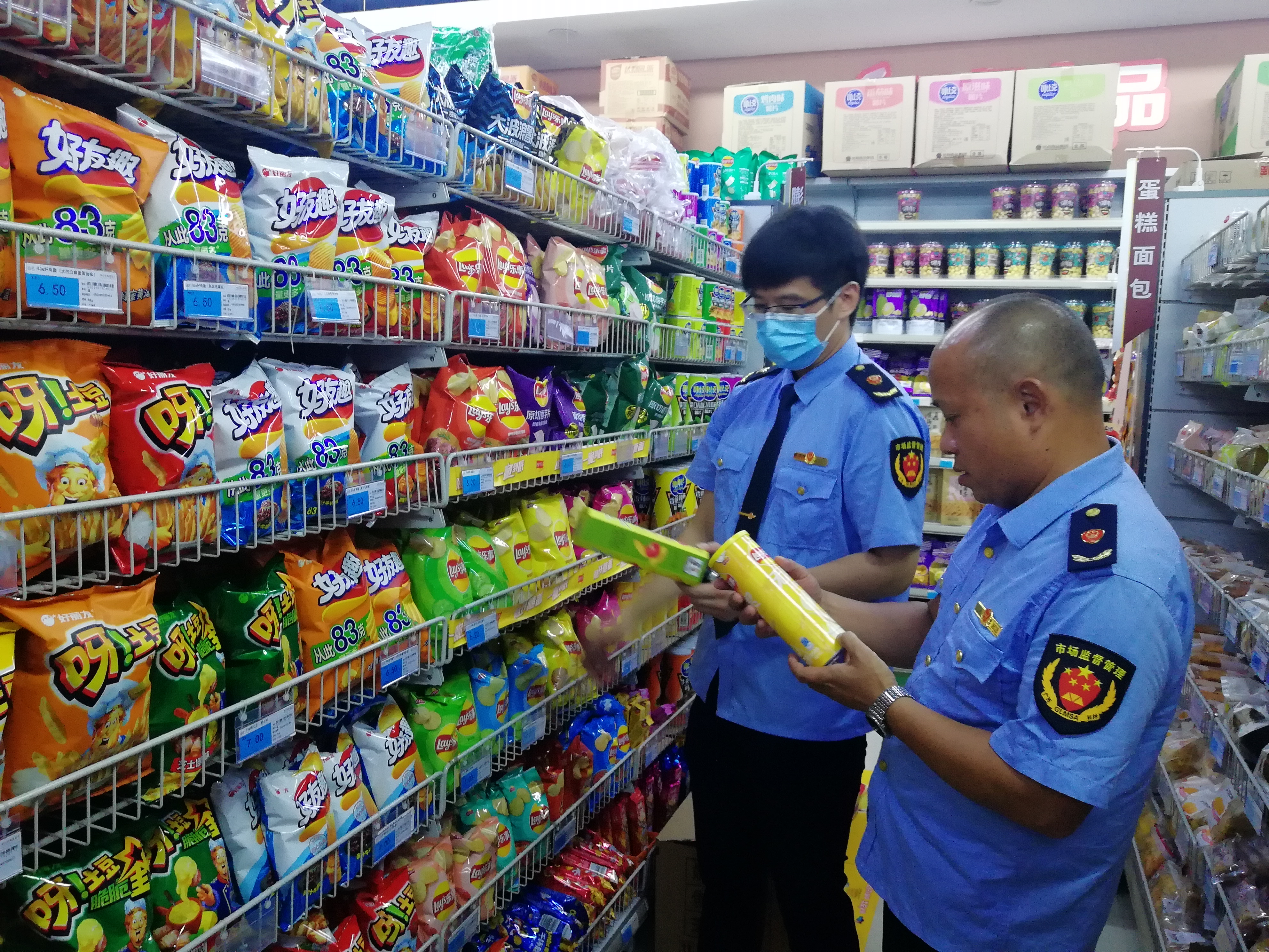 执法人员在进行膨化食品抽样