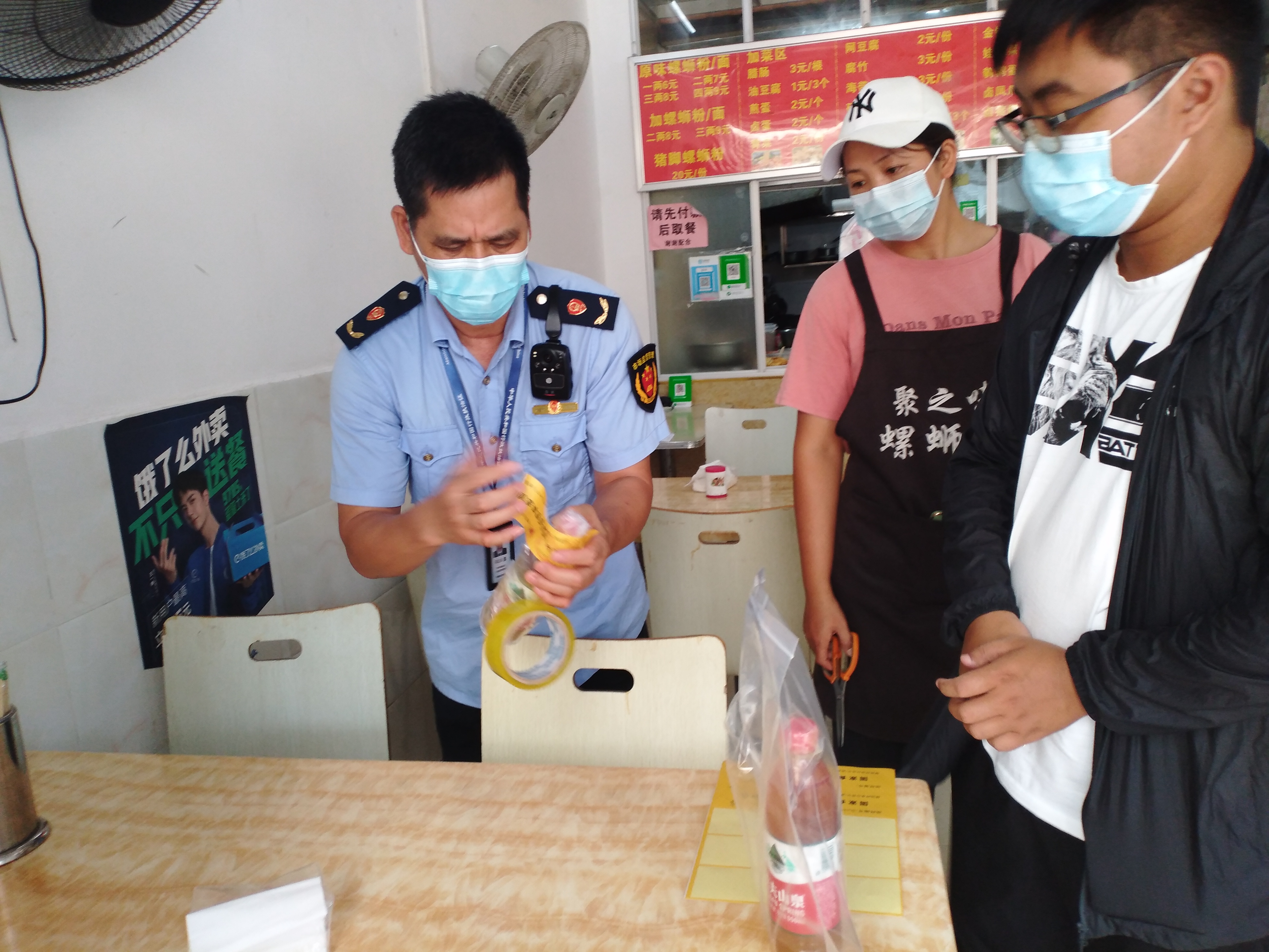 执法人员在进行月饼抽检的封样