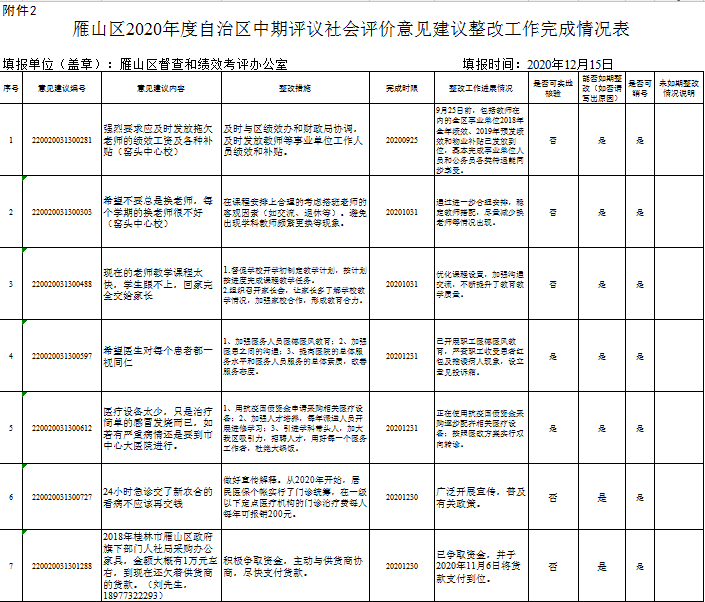 雁山区2020年度自治区中期评议社会评价意见建议整改工作完成情况表