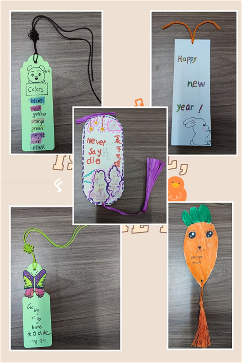 孩子们充分发挥自己的想象力和艺术制作出精美的英语主题书签。画上卡通人物、小动物等配饰,设计完成后在书签上面写下自己喜爱的英语名言,为书签赋予特别的含义。