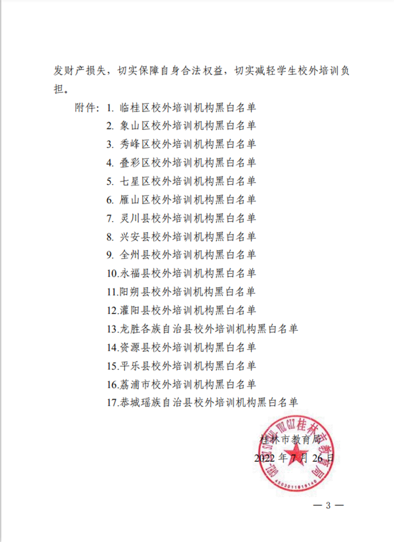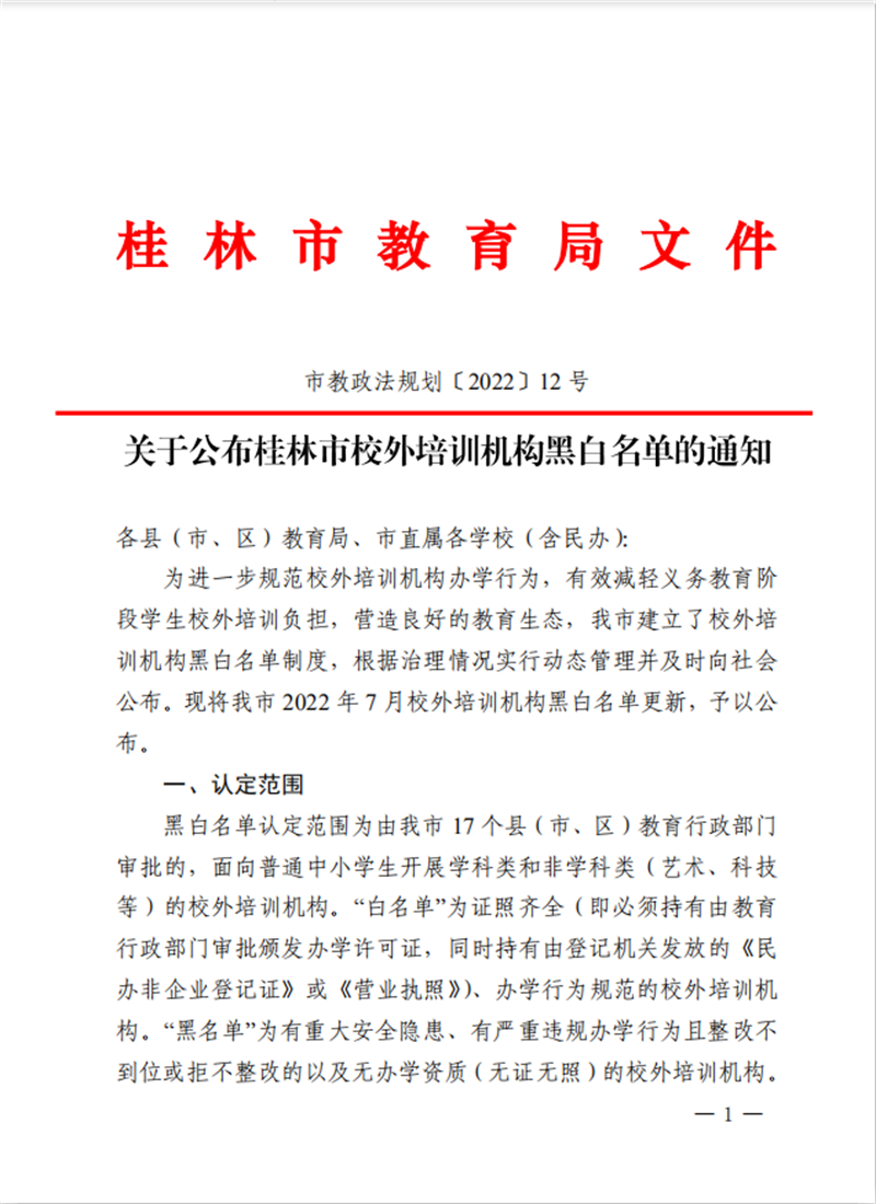 市教政法规划〔2022〕12号 关于公布桂林市校外培训机构黑白名单的通知